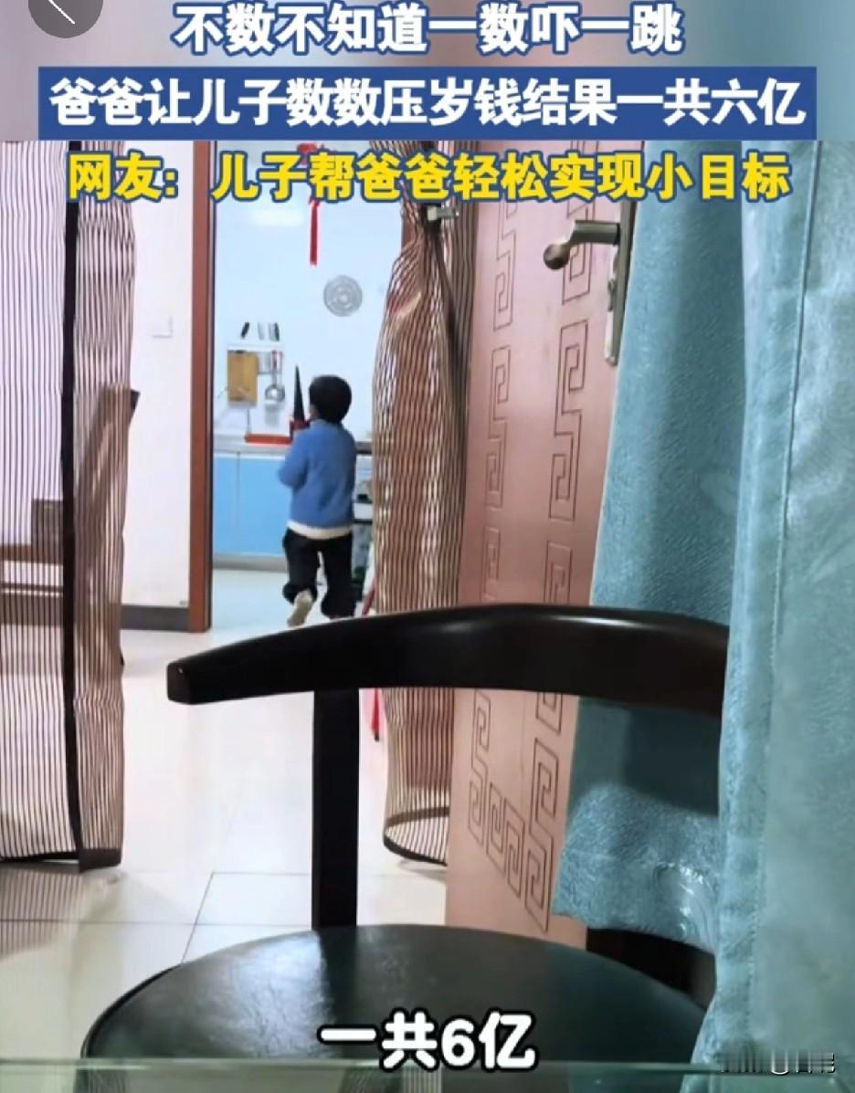 小孩子不会说谎,但是会胡说八道! 一爸爸打算把压岁钱存银行,让儿子数数压岁钱,儿子很听话数着,刚开始都很正常,渐渐开始乱数,三千三变成六亿。不得了,这压岁钱经儿子手,薄薄的一叠钞票升值,金额太巨款了! “一百两百三百四百五百六百七百八百九百十百,哦不对一千,两千三千四千五千六千七千八千九千,1万2万3万4万5万6万7万8万9万10万,1亿2亿3字4亿5亿6亿。”儿子边数边抹汗,好不容易数完,欣喜若狂赶紧理好钞票,飞奔找爸爸,“爸爸,我数好了,一共6亿。” 爸爸听到,惊讶至极,6亿,不断跟儿子确认金额,一度怀疑是冥币。再看看,百元大钞,人民币啊。 新脑袋果然就是好使,与众不同。爸爸上个厕所,儿子成富豪,爸爸成负债的。 事实证明,小孩子不会撒谎,但是会胡说八道。得亏有这视频为证,不然儿子长大了还记着爸爸欠他6个亿。