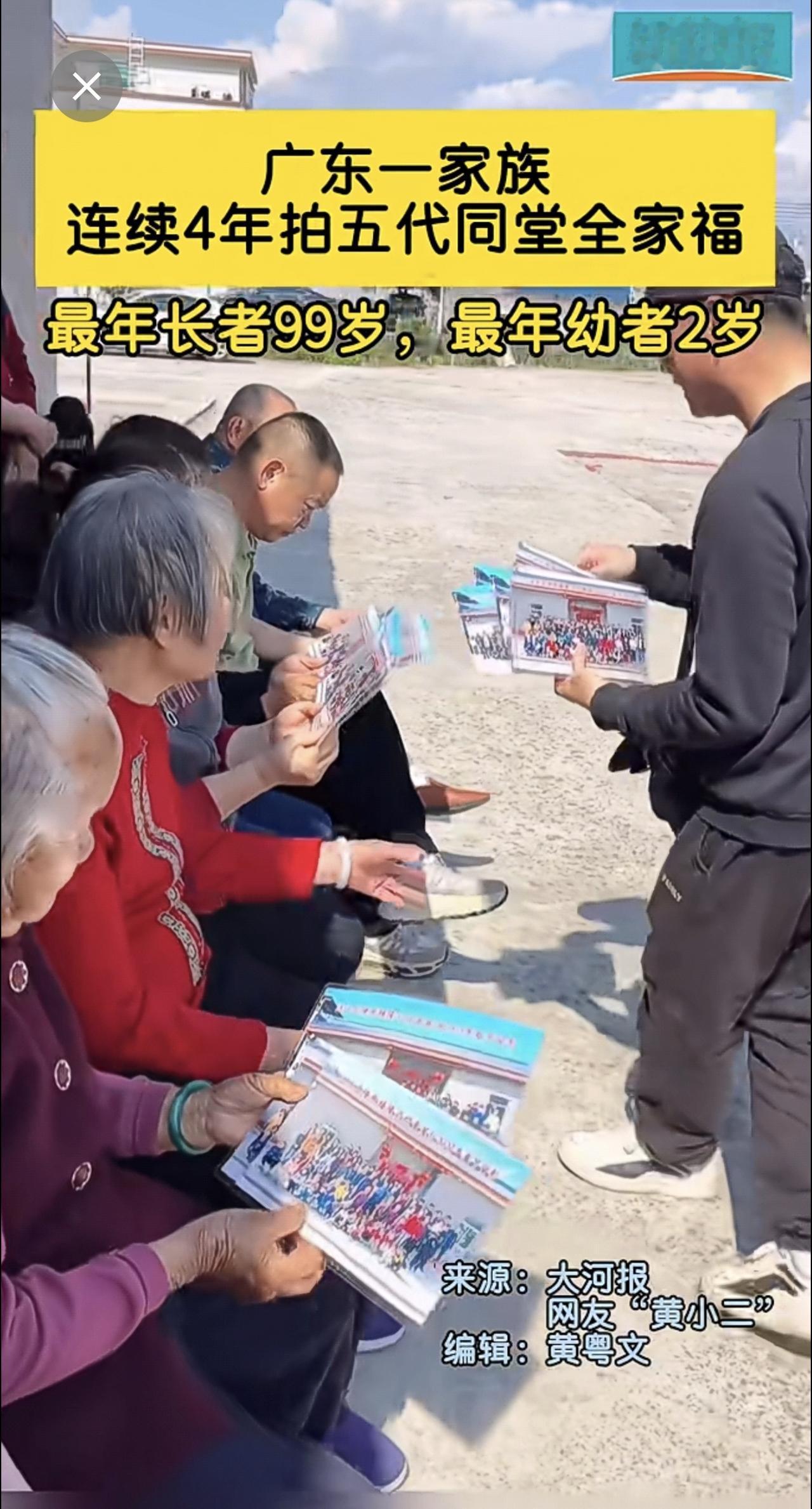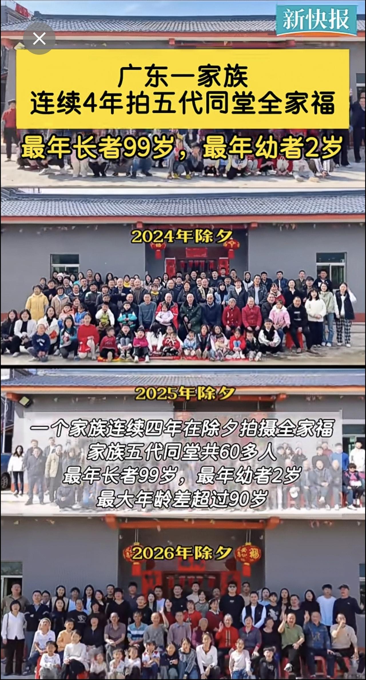 广东一家族连续4年拍五代同堂全家福,最年长者99岁,最年幼者2岁。
