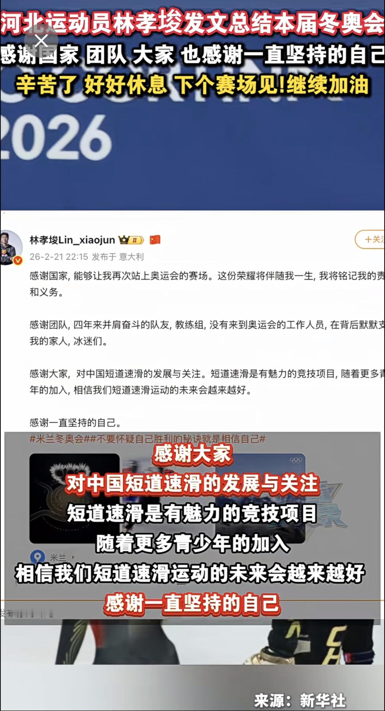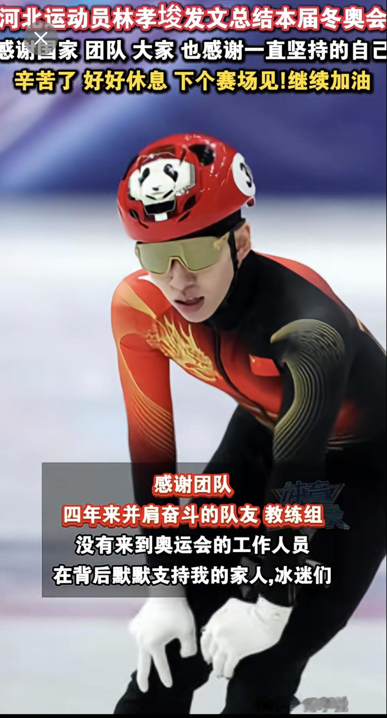 河北运动员林孝埈发文总结本届冬奥会,感谢国家 团队 大家 也感谢一直坚持的自己,辛苦了,好好休息,下个赛场见!继续加油!