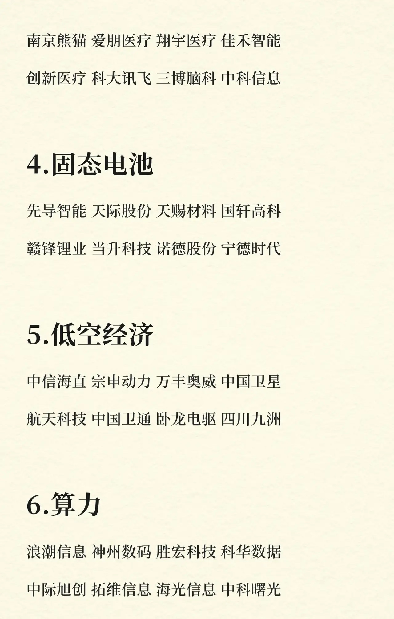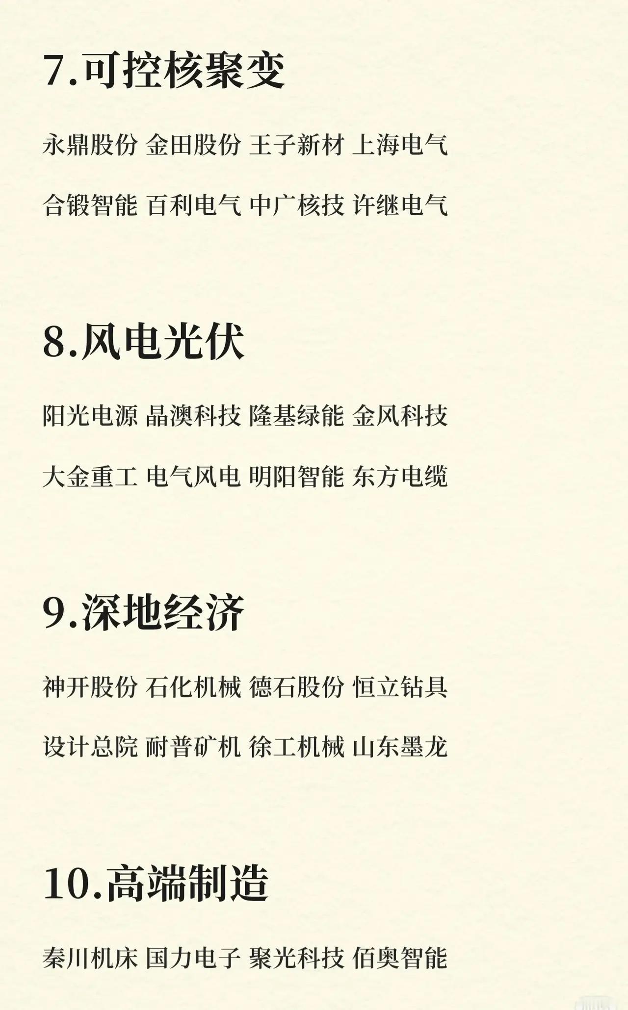 1. 芯片半导体:中芯国际、长川科技、华虹公司、兆易创新、海光信息、张江高科、芯原股份、北京君正2. 人形机器人:长盛轴承、鸣志电器、中大力德、五洲新春、三花智控、柯力传感、卧龙电驱、绿的谐波3. 脑机接口:仅列方向,无企业4. 固态电池:先导智能、天际股份、天赐材料、国轩高科、赣锋锂业、当升科技、诺德股份、宁德时代5. 低空经济:中信海直、宗申动力、万丰奥威、中国卫星、航天科技、中国卫通、卧龙电驱、四川九洲6. 算力:浪潮信息、神州数码、胜宏科技、科华数据、中际旭创、拓维信息、海光信息、中科曙光7. 可控核聚变:永鼎股份、金田股份、王子新材、上海电气、合锻智能、百利电气、中广核技、许继电气8. 风电光伏:阳光电源、晶澳科技、隆基绿能、金风科技、大金重工、电气风电、明阳智能、东方电缆9. 深地经济:神开股份、石化机械、德石股份、恒立钻具、设计总院、耐普矿机、徐工机械、山东墨龙10. 高端制造:秦川机床、国力电子、聚光科技、佰奥智能