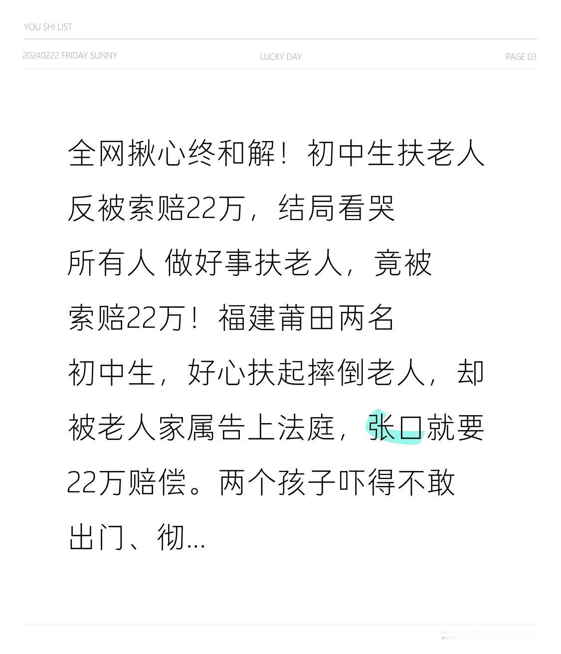 全网揪心终和解!初中生扶老人反被索赔22万,结局看哭所有人 做好事扶老人,竟被索赔22万!福建莆田两名初中生,好心扶起摔倒老人,却被老人家属告上法庭,张口就要22万赔偿。两个孩子吓得不敢出门、彻夜难眠,家长一边心疼一边维权,全网都在问:善良,难道也要被罚吗? 事发时,老人骑车意外摔倒,两名女生路过毫不犹豫下车搀扶。没想到老人家属认定,是孩子骑车吓到老人,直接起诉索赔22万,包含医疗费、伤残赔偿、精神损失等,数额惊人。更让人心寒的是,孩子明明是行善,却要承受被告的压力,小小年纪被蒙上阴影,连学都没法安心上。 家长崩溃发声:我们教孩子要善良、要乐于助人,现在却让孩子觉得,好心会惹祸!普通家庭面对巨额索赔,既委屈又无助,无数网友气得炸锅,纷纷为孩子抱不平:扶人有错吗?以后谁还敢做好事? 转折点来了!开庭前3天,事情彻底反转! 2月21日,原告方正式撤诉,双方达成和解!女孩母亲确认,事情已妥善处理,已删除社交平台内容,不想占用公共资源,只希望孩子尽快回归校园,忘掉这段不愉快。 这场风波,从愤怒到揪心,再到暖心收尾,给所有人上了一课。交警认定为无接触事故,孩子有次要责任,但索赔22万明显过高;老人家属最终撤诉,既是理性回归,也是对善良的让步。 最让人泪目的是家长的格局:不纠缠、不网暴,只护孩子平安。他们没有因为委屈,就毁掉孩子的善良;没有因为愤怒,就激化矛盾。这份宽容,比胜诉更珍贵。 很多人说,这件事让我们重新相信:善良不会被辜负,正义不会缺席。我们既要教孩子见义勇为,更要教会孩子保护自己;既要尊重法律责任,也要守护人间温情。 一场和解,解开的不只是官司,更是无数人心里的结。愿两个孩子早日走出阴影,继续做温暖善良的少年;愿每一份善意都被温柔以待,愿扶不扶不再是难题,愿好人一生平安!