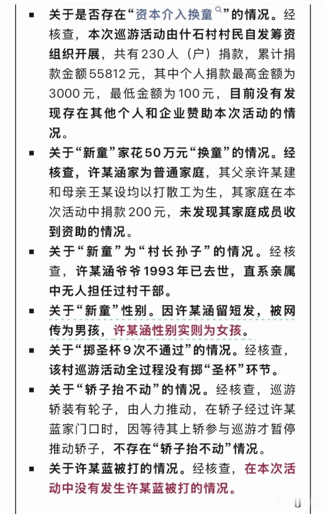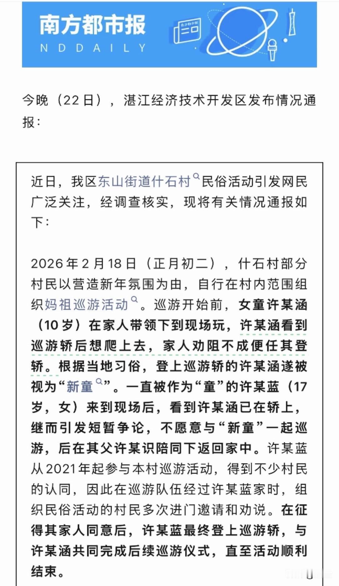 看了那个通报,真的给我气笑了。 说家里人“劝阻无果”,只能看着10岁的娃爬上轿子? 这理由是不是把大伙当傻子哄呢? 咱都是带过娃的,一个十岁的小姑娘,又不是练过武术的壮汉,旁边那么多大人,真想拦能拦不住? 除非压根就没想真拦,或者本来就是“默许”的。 再看那个解释,“上了轿子就是新童”,这也太草率了。 这事儿越描越黑,别拿“习俗”当挡箭牌。 与其在这抠字眼,不如把当初怎么选人的、现场到底咋回事把视频原原本本放出来。 大家想看的是真话,而不是这种糊弄鬼的公关文。
