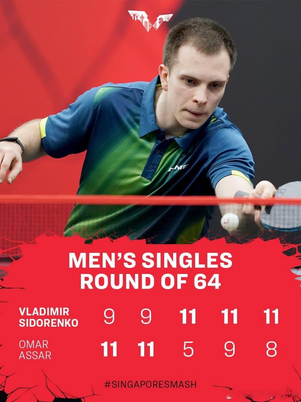 WTT新加坡大满贯2026 资格赛选手弗拉基米尔·西多伦科在他首个WTT大满贯赛事中,以3比2战胜奥玛·阿萨尔