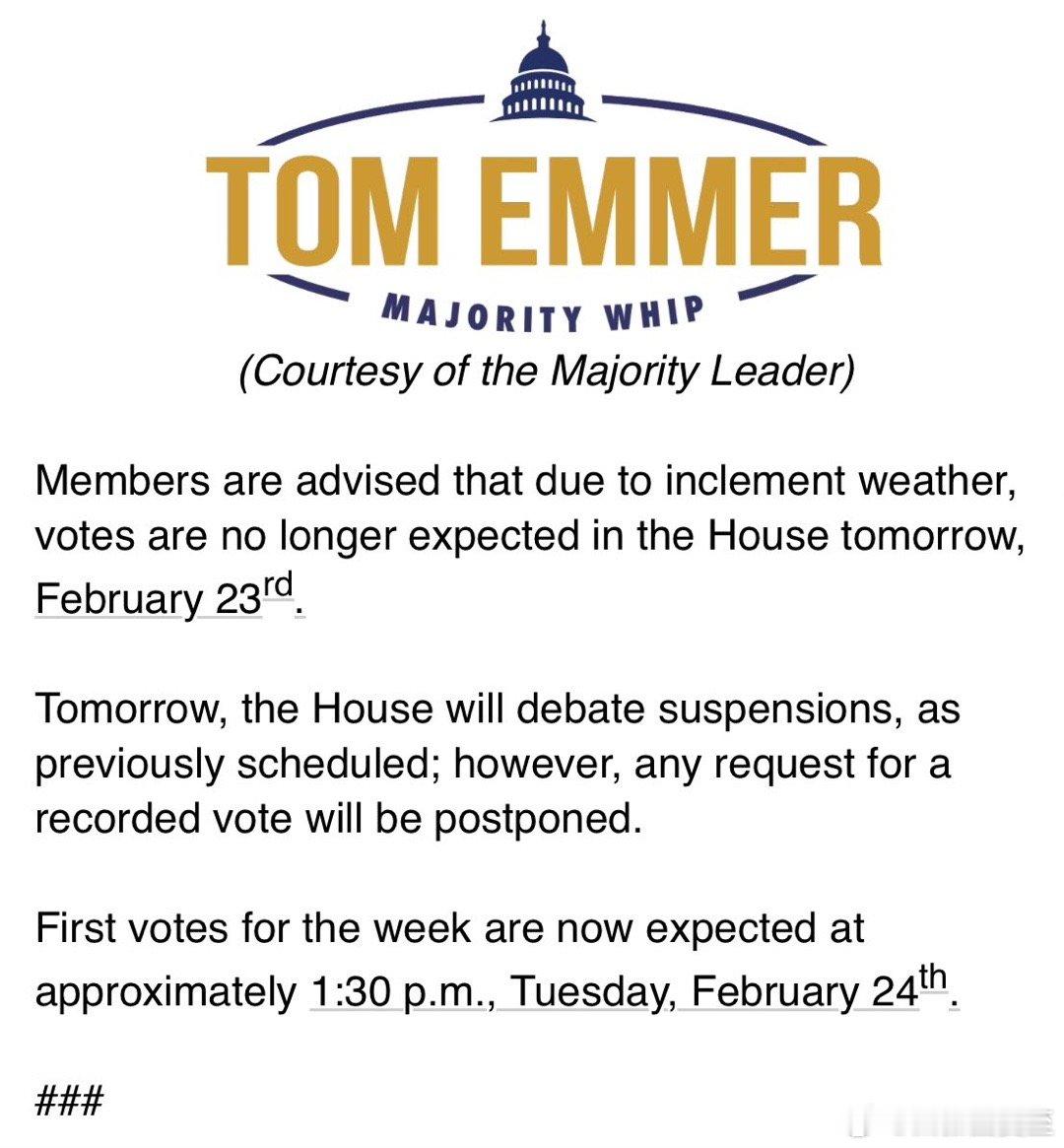 天气原因,国会取消周一的投票目前暂定周二恢复(周二晚,是总统国情咨文,如果DC天