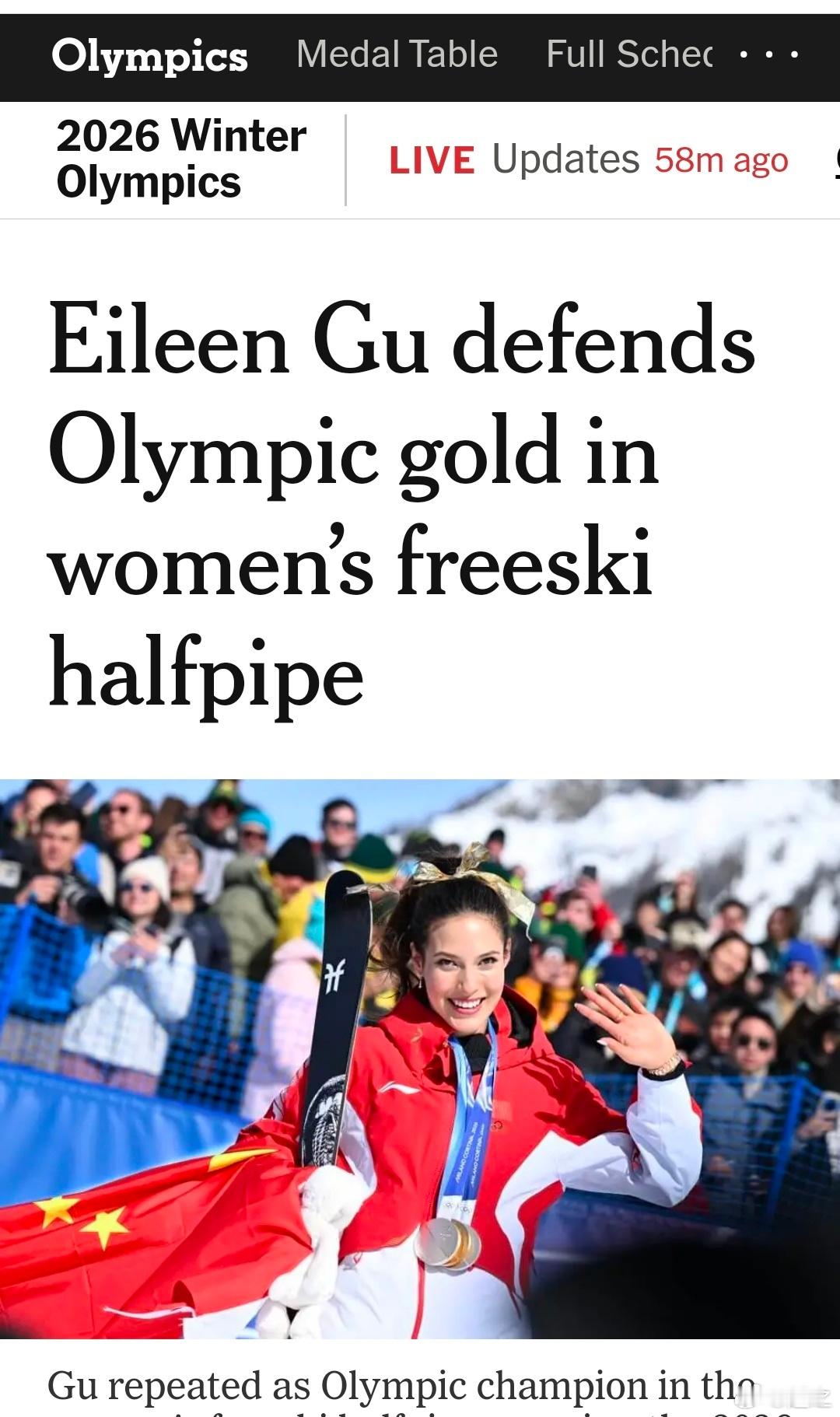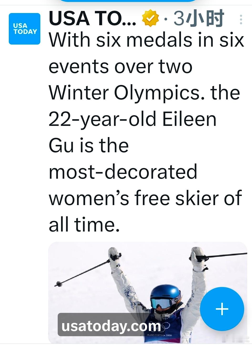 谷爱凌唱国歌纽约时报说,谷爱凌可以躺平了,她完成了自己在意大利的任务。第二张图是雅虎体育的,说明谷爱凌在两届冬奥会获得了6枚奖牌。今日美国,22岁的谷爱凌是自由式滑雪历史上获得奥运奖牌最多的女选手。