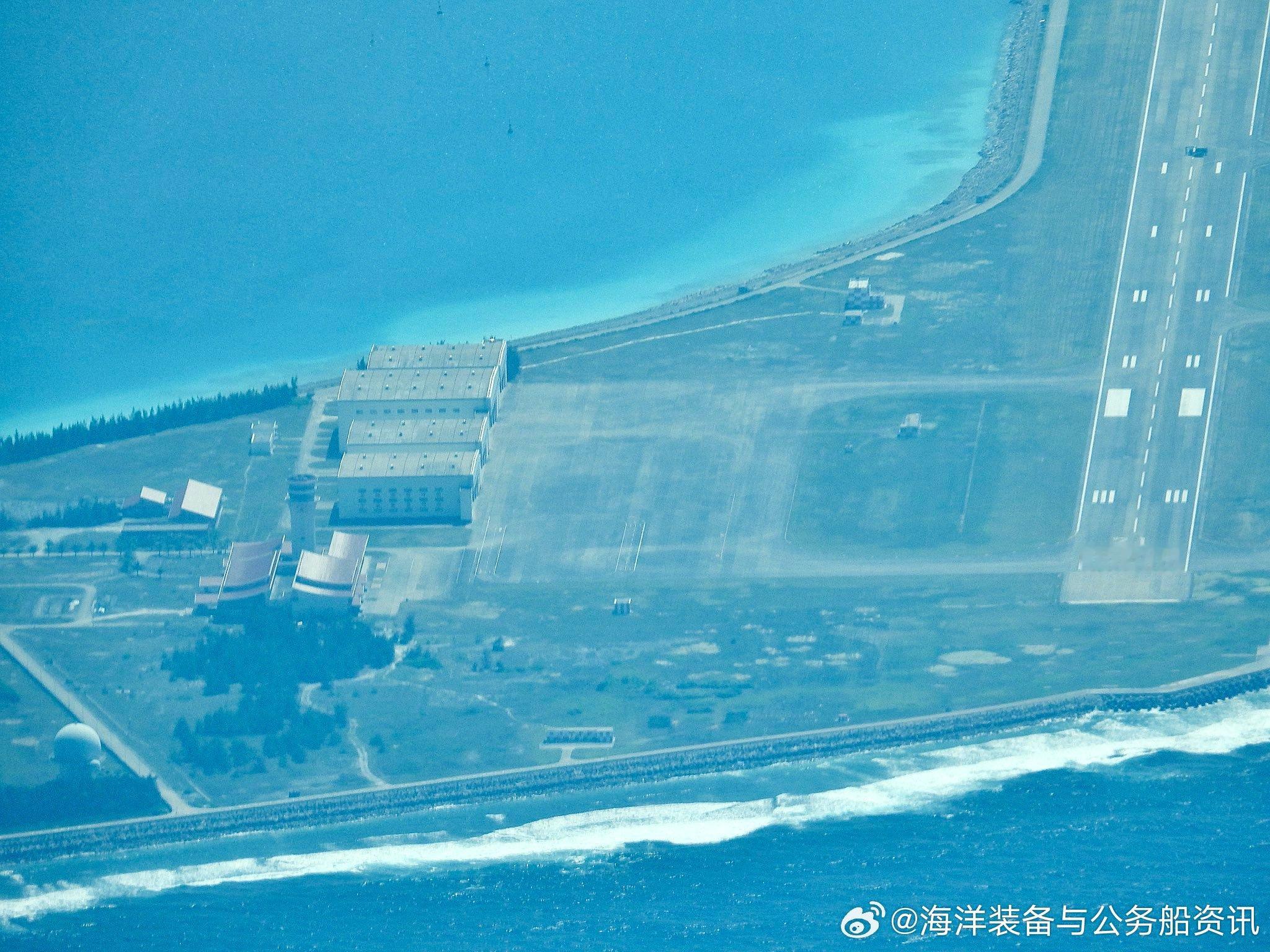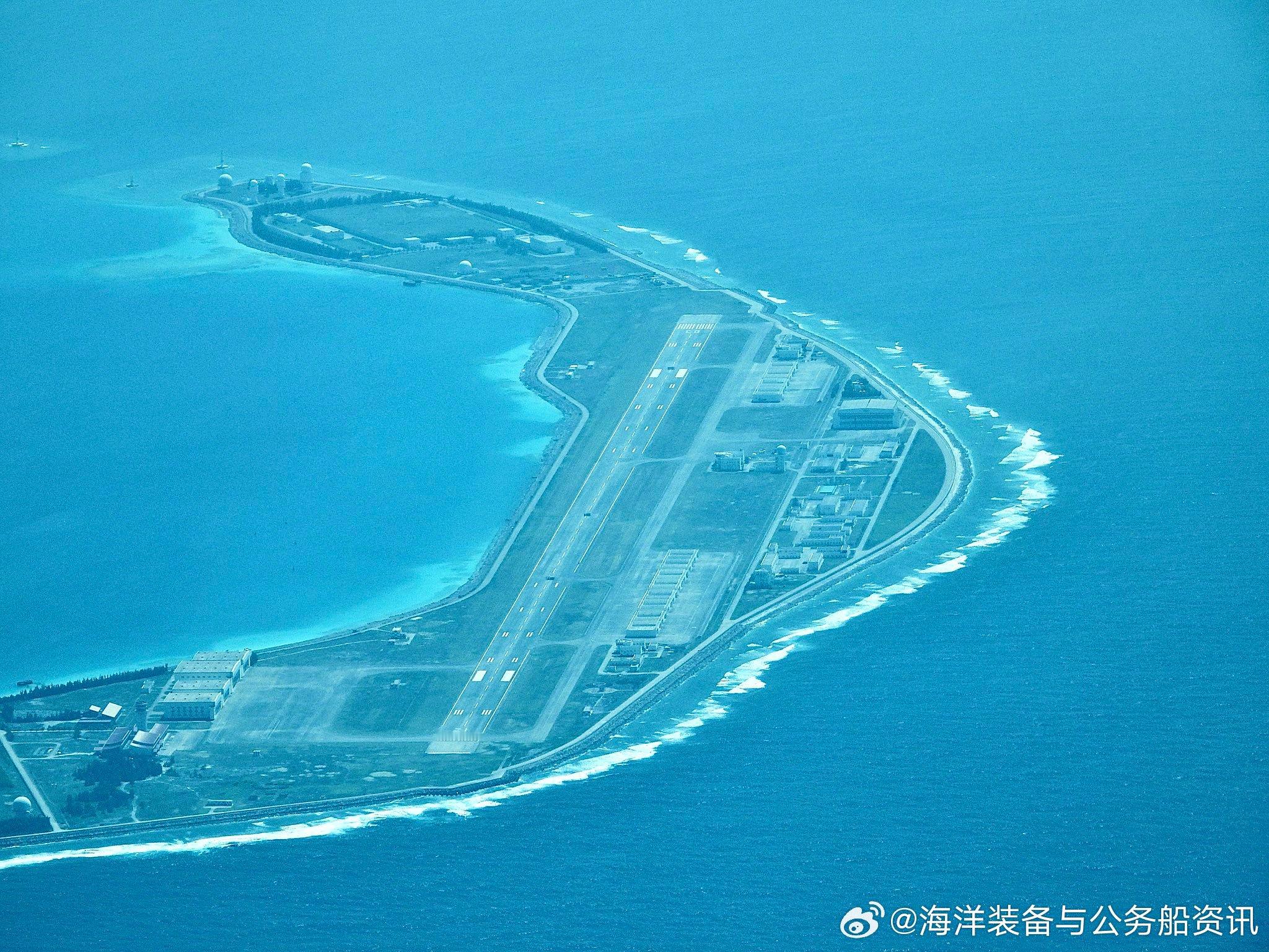 南海维权巡航专项 【岛礁】2026年2月21日中国南沙群岛美济礁组图。飞机从美济礁向东侧-东北侧-北侧飞过,距离应在数十公里上下。远摄照片可看到岛礁码头上停靠着人民海军的一艘054A型导弹护卫舰和两艘22型隐身导弹艇。在机场跑道上也布置有“反突降”措施。还能在镜头中清晰的看到美济礁“鬼斧神工”前北端的老礁堡。人民海军 【详情】网页链接