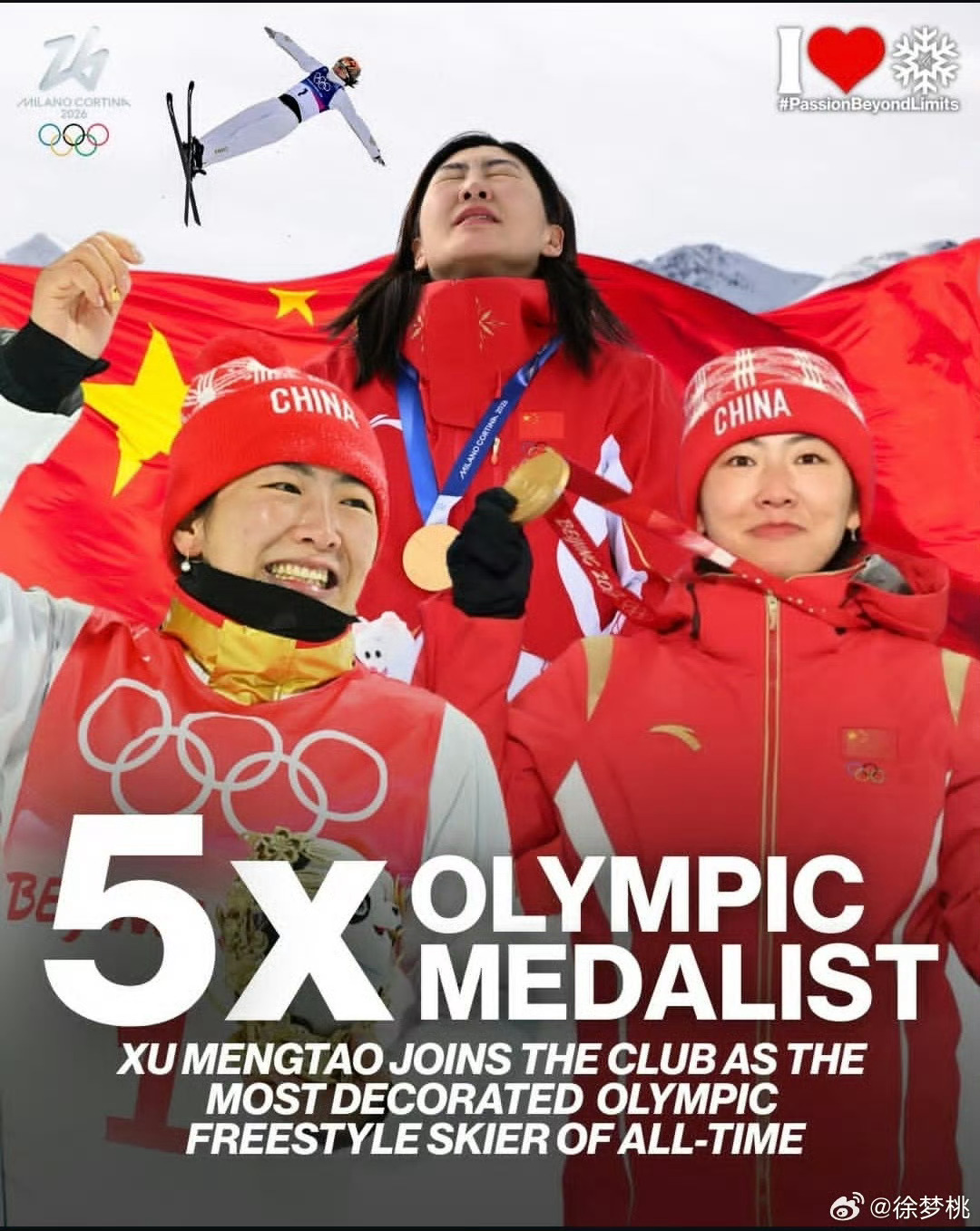 发博总结米兰冬奥会:站在米兰冬奥会闭幕式现场,回望五届冬奥、二十年坚守,心中满是感慨与感恩❤️从温哥华到米兰,从青涩小将到卫冕冠军🥇这条路有伤痛、有低谷,更有永不放弃的热爱。这届冬奥,我卫冕空中技巧金牌,创造项目历史突破,收获团体铜牌,集齐冬奥金银铜5枚奖牌👊中国空中技巧创下境外最佳战绩,是团队、祖国与家人托举我站上巅峰。闭幕式上,奥林匹克圣火缓缓熄灭,我更读懂传承的意义。安慰失误的年轻队友,说“四年后再来”,是希望把不服输的精神传递下去;35岁依然能突破极限,是想证明热爱可抵万难,年龄从不是追梦的枷锁。感谢米兰,让我的奥运生涯更加丰富;感谢每一份陪伴,感谢从未放弃的自己。圣火虽熄,热爱不息,中国冰雪的故事,还会继续书写👊徐梦桃的传奇,仍在继续!爱你们
