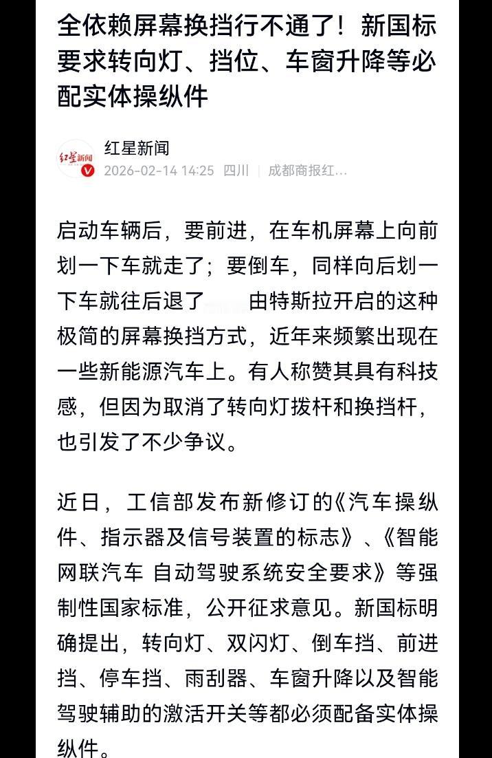 孙少军发文“屏幕换挡行不通了!” 虽然只是征求意见稿阶段,但应该也快了。 有网友评论“最反人类的两个设计是隐形门把手和屏幕换挡。” 就说哪家车企彻底慌了? #晒图笔记大赛#
