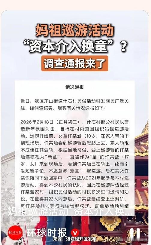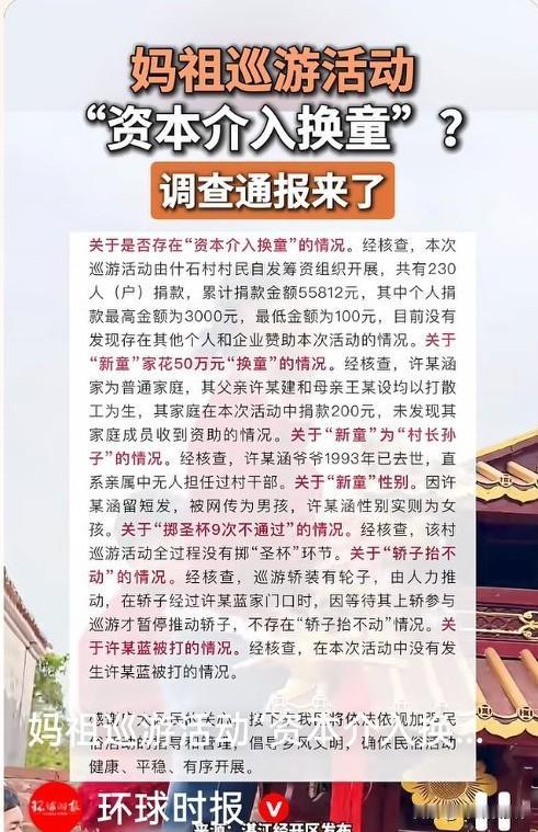 看看湛江一纸澄清通报,原来有关妈祖乩童一切传言都是假的 第一 ,掷圣杯是假的,没有这个环节 第二,替代妈祖乩童的男孩是假的,而是普通家庭的女孩子,是偶然而好奇登上了轿子,被误作了乩童而巡游 第三,妈祖乩童女孩被欺负也是假的,只不过是路过其家门时有人邀请其同行罢了 第四,网传盛大的妈祖附身也是假的,只不过是一个村子的民俗庆新年活动罢了 第五,网传许老板或者村干部更是假的,一切都是村子自发组织的 一纸通报,所有的传言都是谣言 但是那么多视频都摆在那里,大家也看得清清楚楚 到底该信谁,从妈祖乩童的女孩子委屈的眼泪中,让人看不清楚 看似解释事情原委的一纸通报,不仅没有让事情消停下去,相反倒有了遮掩曲解的味道 也许妈祖就是传说,只不过是大家想多了 这样的活动,来年还是取消吧