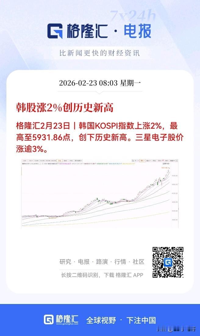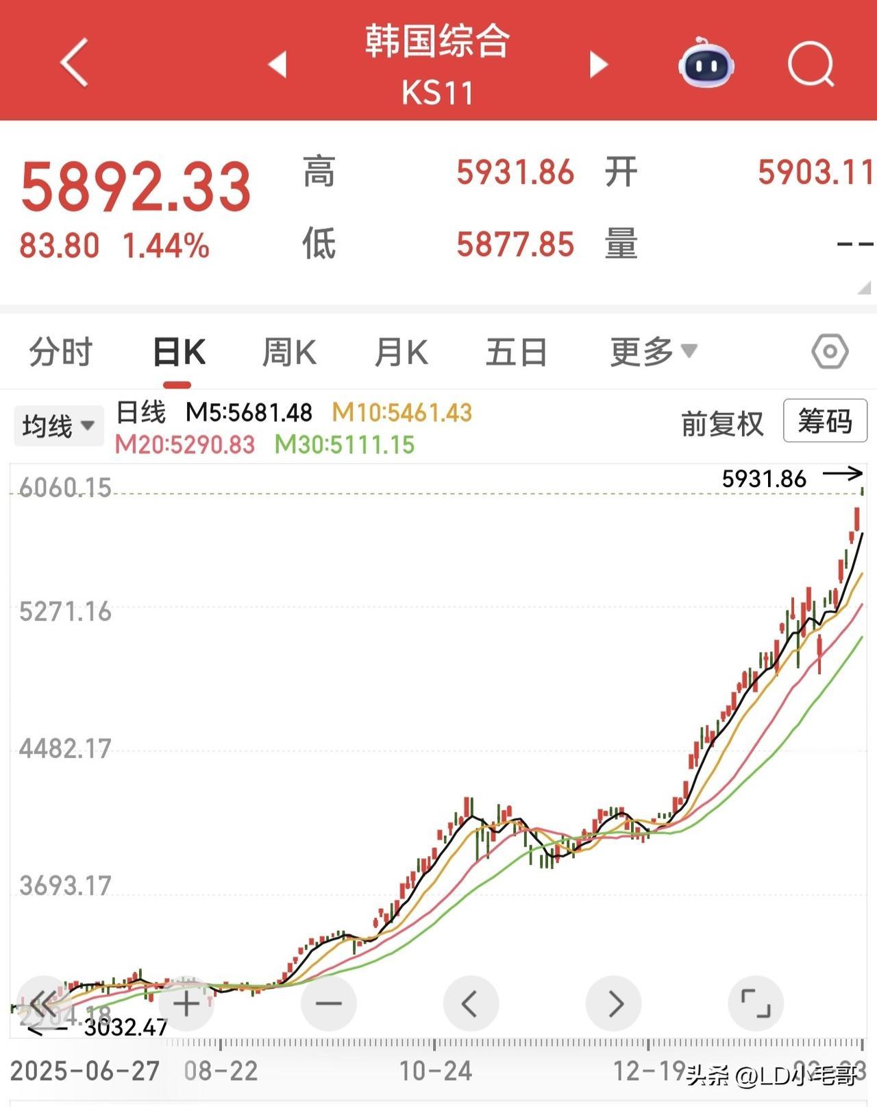牛了!真的没什么能阻止韩国股市上涨了?又创历史新高了,咱们大A能学着点吗? 今天一开盘,韩国股指直接大涨2个点,续创历史新高!指数即将突破6000点的关口。 韩国股指去年直接涨了75个点,好家伙,今年才不到两个月,直接干了近40个点! 就问大家牛不牛? 全球股市,谁能与之匹敌?谁能与之争锋?谁能干得过? 明天大A就开盘了,能补发一个大红包吗?