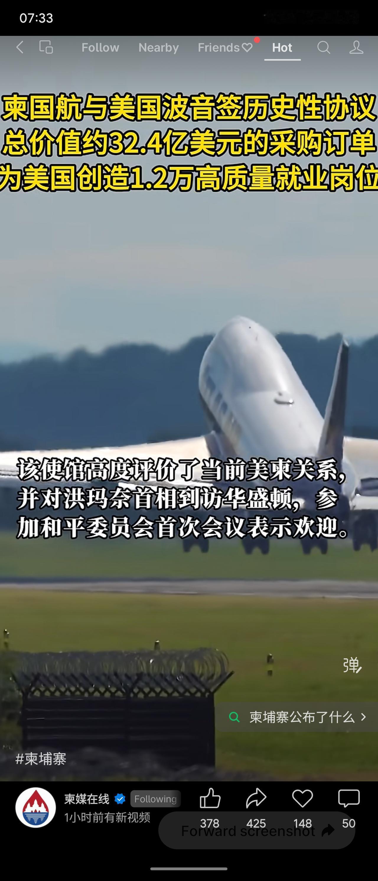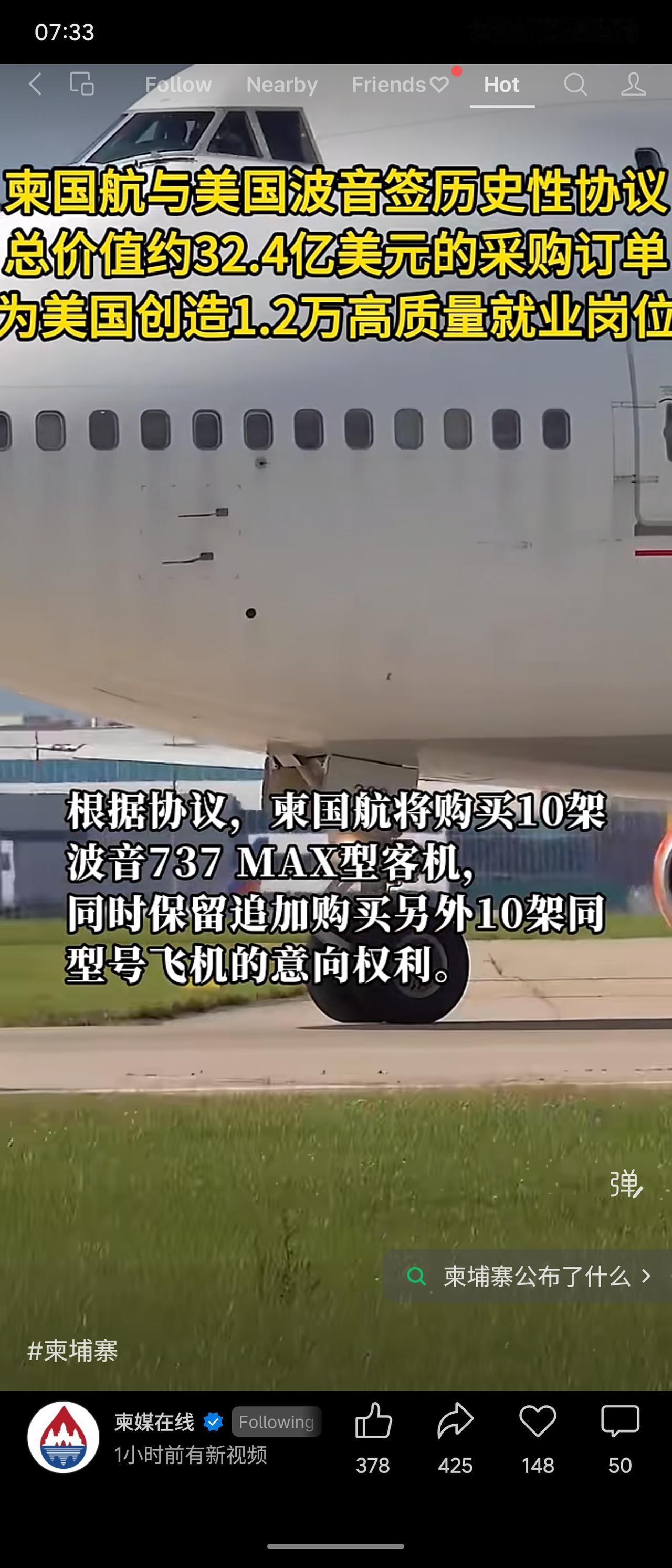 柬埔寨国家航空公司与美国波音签署历史性协议,采购10架波音737 MAX客机,总价值约32.4亿美元,并可追加10架。这笔订单将为美国创造1.2万个就业岗位,美国驻柬使馆对此表示欢迎,并积极评价美柬关系。