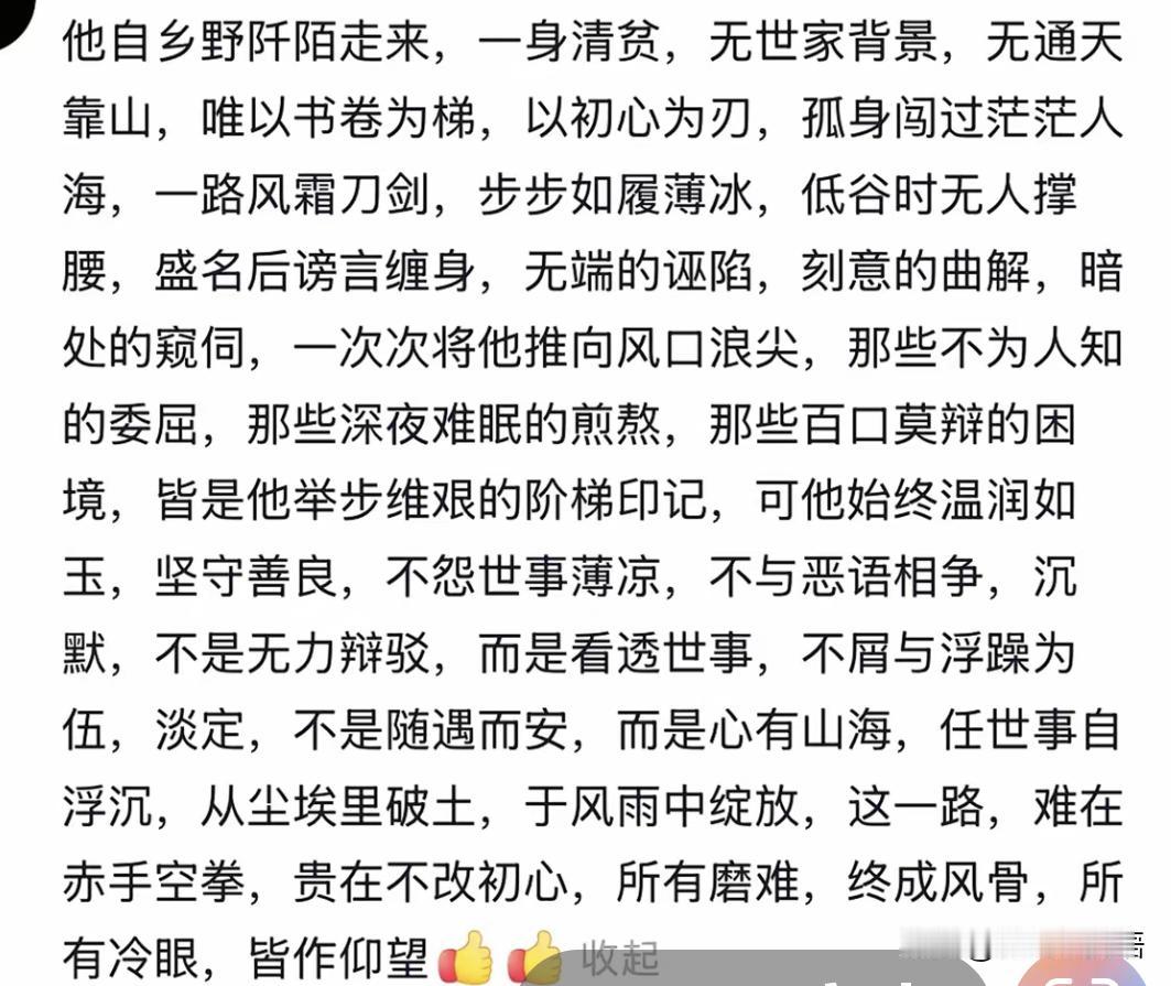 索娅新留言被中学老师这样解读,索娅心声,字字用心,句句含情,替你我说出对宇辉的疼爱。纸上泪痕犹可见,看得人瞬间破防。 看后,更心疼董宇辉,也更理解才女索亚不愧是宇辉的第一粉丝,她太懂董宇辉了,字字饱含深情,句句发自内心。看哭的粉丝都说,这与其说是粉丝留言,毋宁说是一位母亲看到在外奔波一年,受尽委屈的儿子后,心疼儿子的一顿唠叨。 我试着解析一下索亚这段留言(全文见下图三) 1. 他自乡野阡陌走来,一身清贫,无世家背景,无通天靠山。 点评:好似含泪的母亲在自责泣泪说,没有给儿子强大的背景。 原来你所有的光芒,都不是生来自带, 是赤手空拳,从泥土里一点点挣出来的。 别人有伞,你只有自己的肩膀。 光是想到你起点的孤单,就忍不住鼻酸。 2. 低谷时无人撑腰,盛名后谤言缠身 点评:好似为帮不上忙而更加心疼 难的不是吃苦, 是难的时候没人撑, 红的时候却有人踩。 人间最凉,莫过于此。 3. 无端的诬陷,刻意的曲解,暗处的窥伺 点评:世上不是好人多吗?我儿怎会遭受这样的不公。 世界把最锋利的刀, 都对准了最心软的人。 你没做错什么, 却要承受那么多莫须有的伤。 4. 那些不为人知的委屈,那些深夜难眠的煎熬,那些百口莫辩的困境 点评: 能忍是需要强大内心的 『人前云淡风轻, 人后夜夜难安。 你把所有破碎, 都悄悄自己粘好, 不让任何人看见。』 5. 可他始终温润如玉,坚守善良。 点评: 最让人心疼的, 从来不是你受过多少苦, 而是你被世界伤过, 却依然不肯变得尖锐, 依然把温柔留给人间。 6. 沉默,不是无力辩驳,而是看透世事,不屑与浮躁为伍 点评 你不是不会争, 是不愿脏了自己的心。 你的安静, 是最有骨气的温柔。 7. 从尘埃里破土,于风雨中绽放 点评 别人是顺风顺水长大, 你是在狂风里开花。 每一片花瓣,都带着伤, 却开得比谁都干净明亮。 8. 这一路,难在赤手空拳,贵在不改初心 点评 赤手空拳闯人间, 已是不易。 更难的是, 走过万水千山, 心还像最初那样干净滚烫。 9. 所有磨难,终成风骨,所有冷眼,皆作仰望 点评 命运给你的所有刁难, 最后都成了你的铠甲。 那些曾看不起你的眼, 终会变成仰望你的光。 看着自己在外受尽委屈、却依旧善良的孩子,含泪写下的心疼。 字字是牵挂,句句是心疼。你会这样认为吗?请将您的留言分享于后。董宇辉 与辉同行