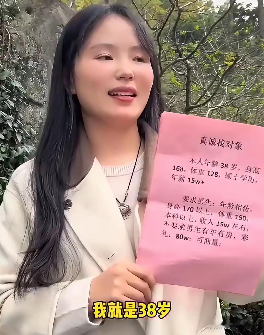 这年头相亲,没点“硬菜”都不好意思出门。这位38岁的女硕士,年薪15w+,一开口就是80万彩礼,还扬言“今年80万,明年直接100万”,把在场的老爷们儿整得一愣一愣的。 相亲女(举着粉色征婚牌,一脸理直气壮):我今年38,身高168,体重128,硕士学历年薪15w+。要求男生年龄相仿、本科以上、收入15w左右,不要求车房,但彩礼80w,可商量。 相亲男A(凑过来打趣):妹子,你这彩礼还带“年度涨幅”啊?今年80万,明年100万,那等你48岁,岂不是要180万? 相亲女(翻了个白眼):你少在这儿阴阳怪气。我这是“价值投资”,懂不懂? 相亲男B(吊儿郎当):娶你?我就给10块钱,多一分都没有。 相亲女(气得脸通红):我就算水泥封住了,也不嫁你这种抠搜玩意儿。 相亲男C(推了推眼镜,冷笑):80万?我给你80万,你能给我什么?给我生个孩子?还是给我当保姆?你这是卖自己还是卖子宫? 相亲女(破防尖叫):你放屁!我是找灵魂伴侣。 围观大爷(捋着胡子摇头):现在的年轻人,真是把婚姻当买卖了。80万彩礼,够在县城买套房了,她是镶金了还是镀银了? 相亲女(叉腰反驳):我年薪15w+,硕士学历,不要求车房,80万彩礼高吗?你们这些男人,既想白嫖又想当大爷,做梦去吧。 这场闹剧最终以相亲女愤然离场告终,留下一群人在原地议论纷纷。有人说她“狮子大开口”,也有人觉得她“坦诚得可爱”。但无论如何,当婚姻变成一场明码标价的交易,再高的学历和收入,也难掩骨子里的廉价。 大家对此事怎么看? 女生相亲条件 大龄姑娘相亲 女生相亲新要求 大龄女子相亲 相亲女 女生的相亲方式 相亲费用