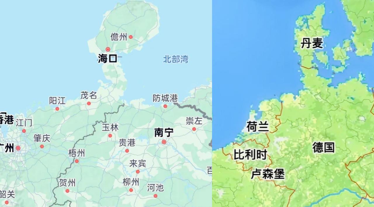 把地图调个方向,结果有不一样的发现啊! 让广东、广西、海南在地图上来一个360度转向,一看和欧洲一个地区的地图很像啊! 这样一眼看上去,是不是两个地图很像啊?