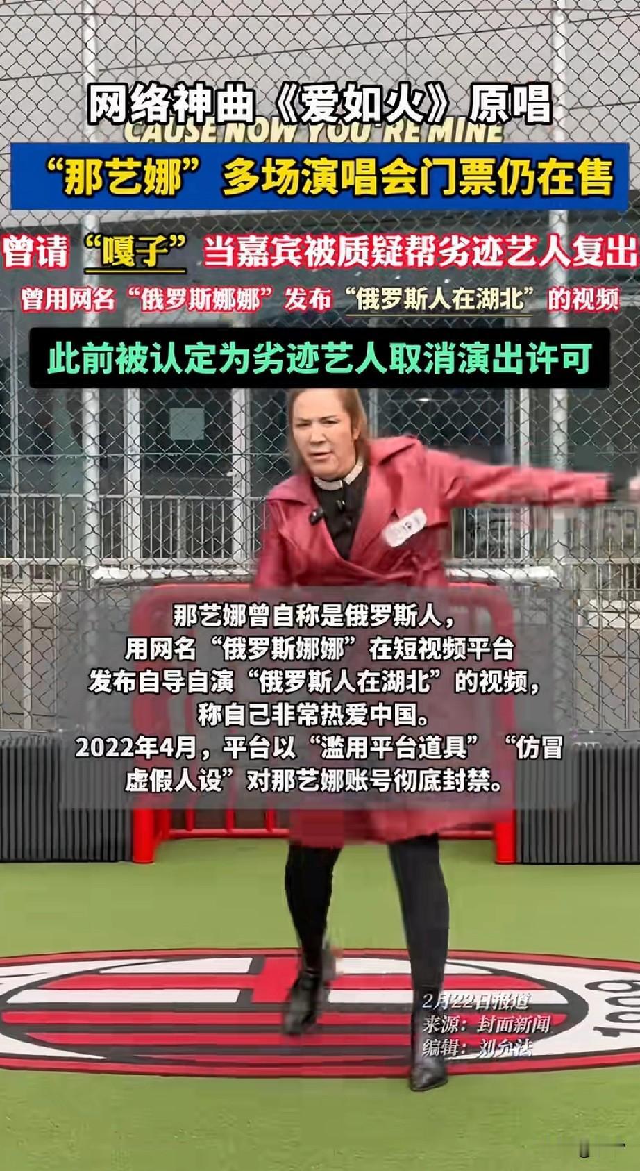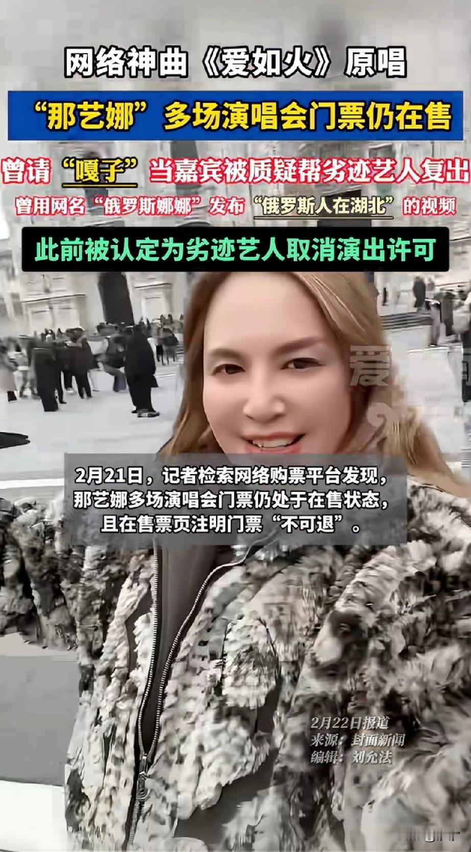 近日,湖北襄阳市襄城区, 发布了艺人那艺娜属于劣迹艺人, 并撤销了她所在公司的演艺许可, 这位女艺人明明是中国人大妈, 却在网络上冒充俄罗斯美女, 凭借这个身份吸粉百万, 还在网上给老年人买保险, 如今被认定为劣质艺人, 但是她的演唱会门票还在出售, 这位中国大妈凭借《爱如火》, 火遍大江南北, 还曾经请嘎子来自己的演唱会, 被指责帮助劣迹艺人复出, 如今她自己也自身难保, 曾经在演唱会上被人喊退票, 目前市场上对于劣迹艺人复出, 可以说是零容忍, 但是她的门票还在售卖, 并且标注不可退, 这样的人还活跃在舞台上, 真可谓相当的讽刺, 大家对于那依娜被认定为劣迹艺人这事怎么看? 那艺娜巡演 那艺娜唱功 那艺娜北京巡演 娜艺娜假唱 那艺娜演唱会 失德女艺人