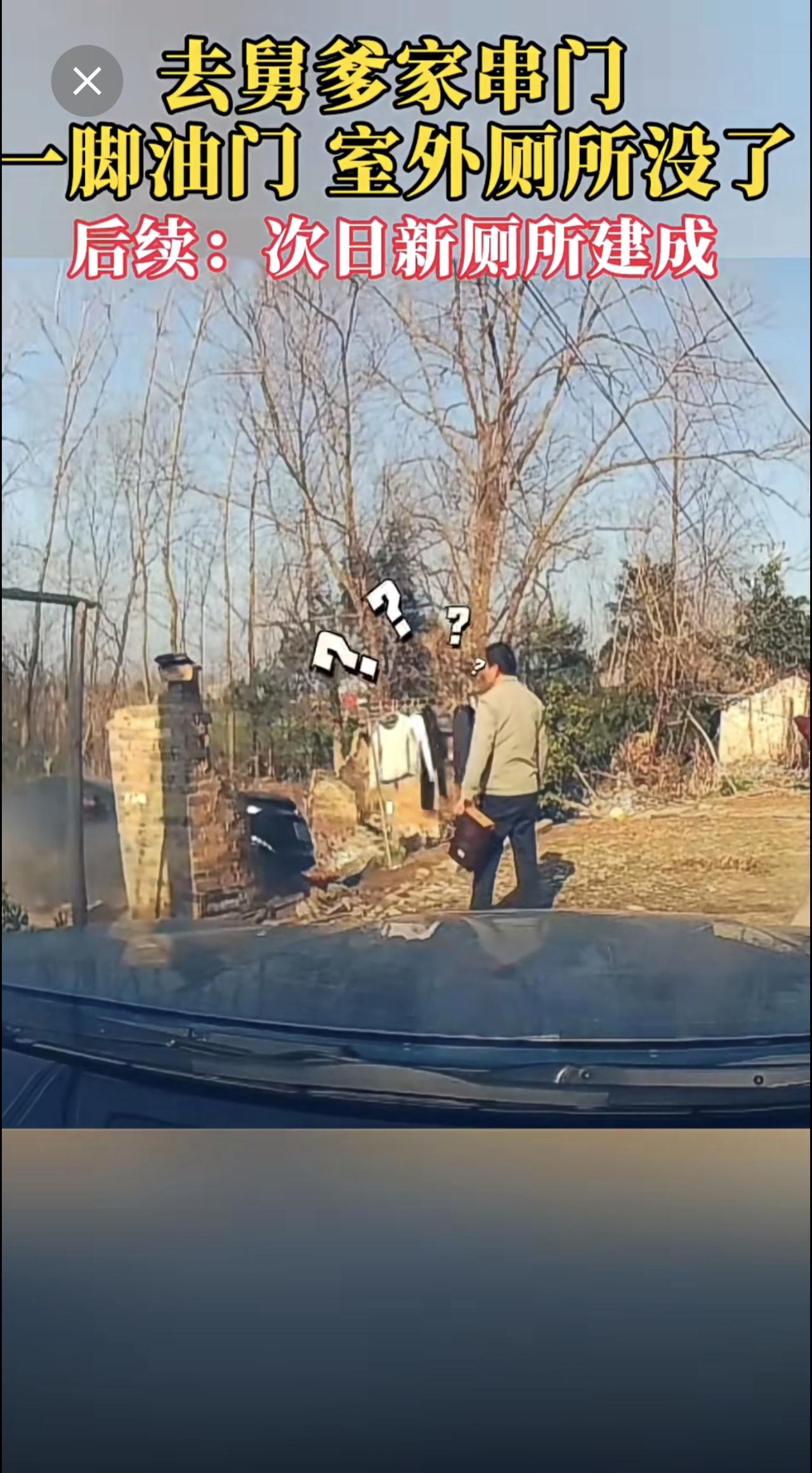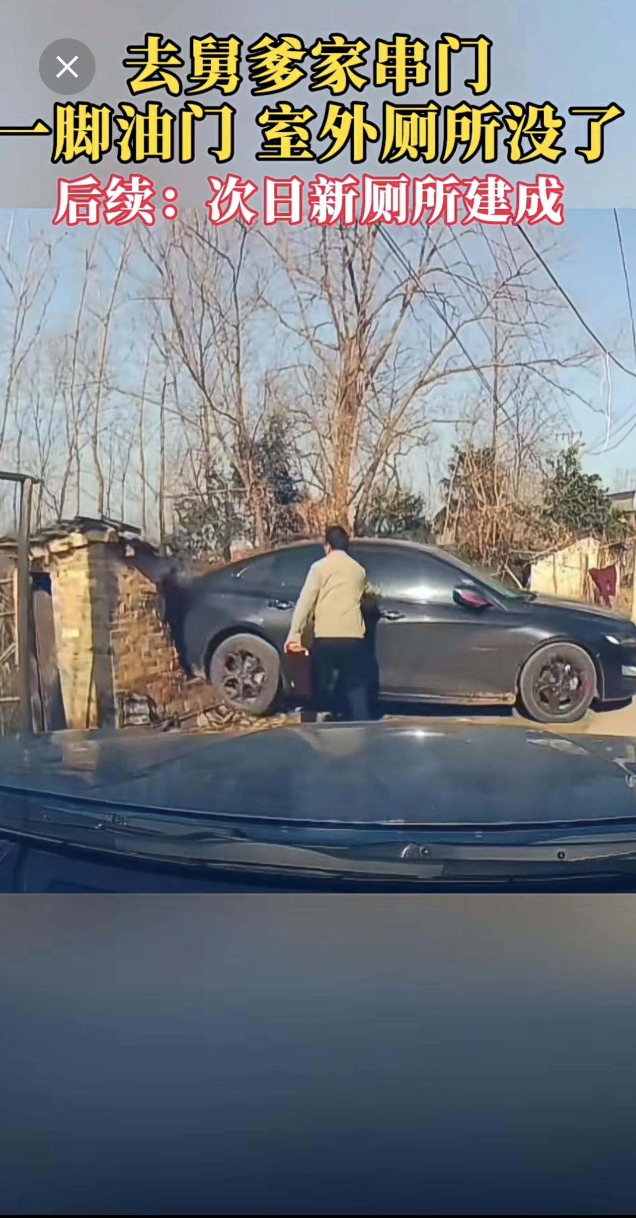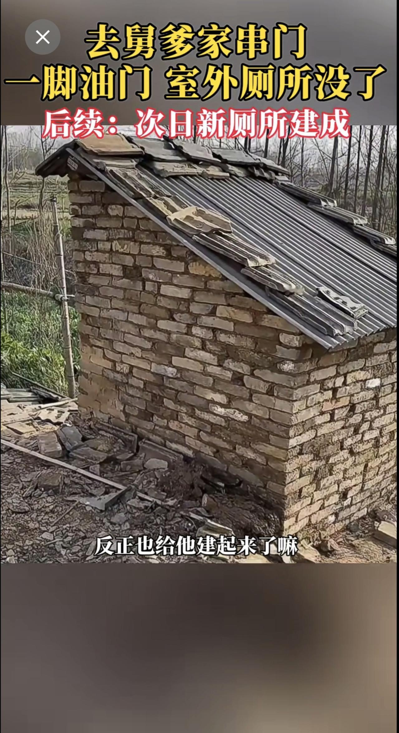 去舅爹家串门,一脚油门,室外厕所没了。后续:次日新厕所建成。 网友:舅的不去,甥的不来[捂脸][捂脸]