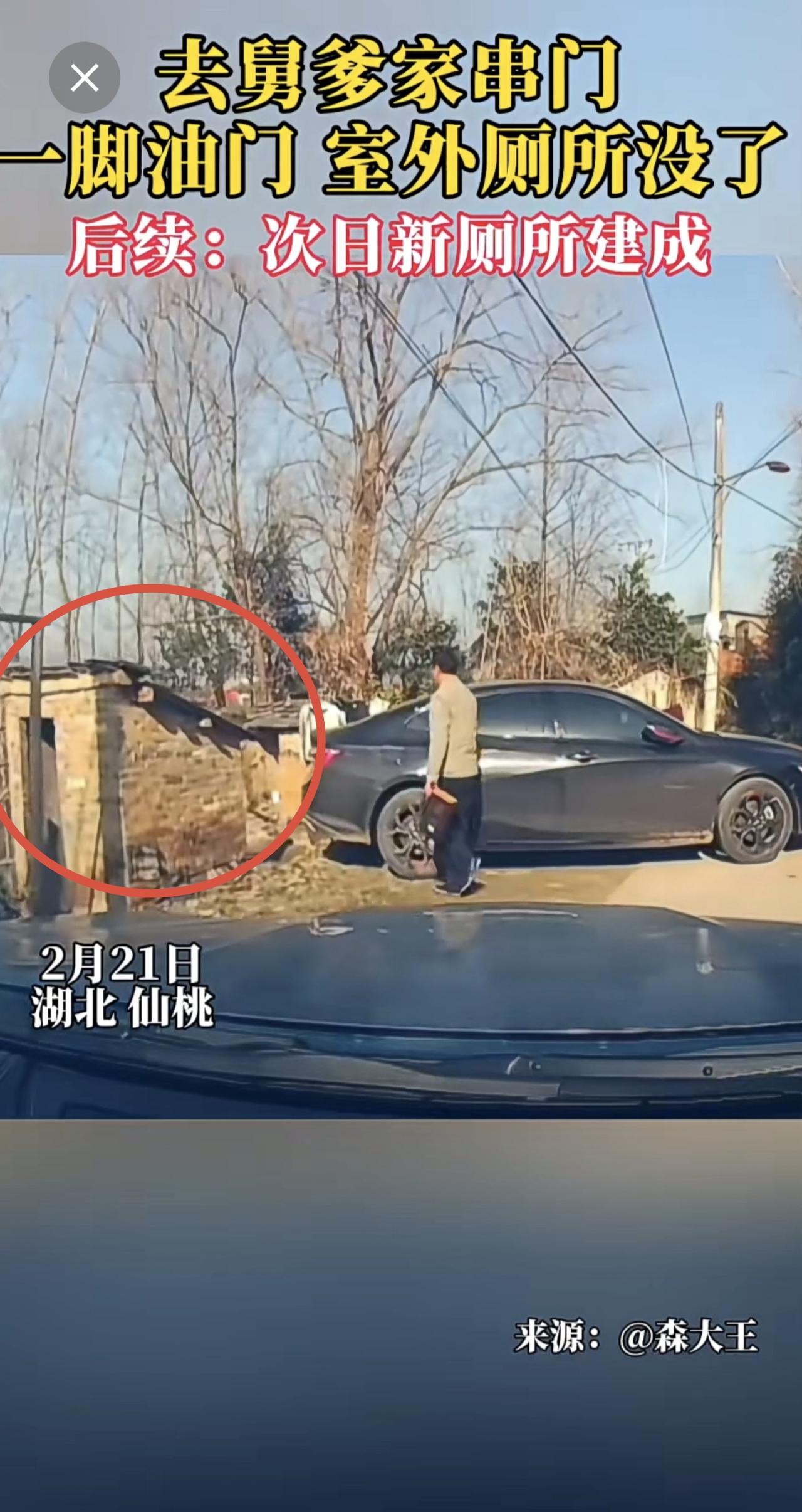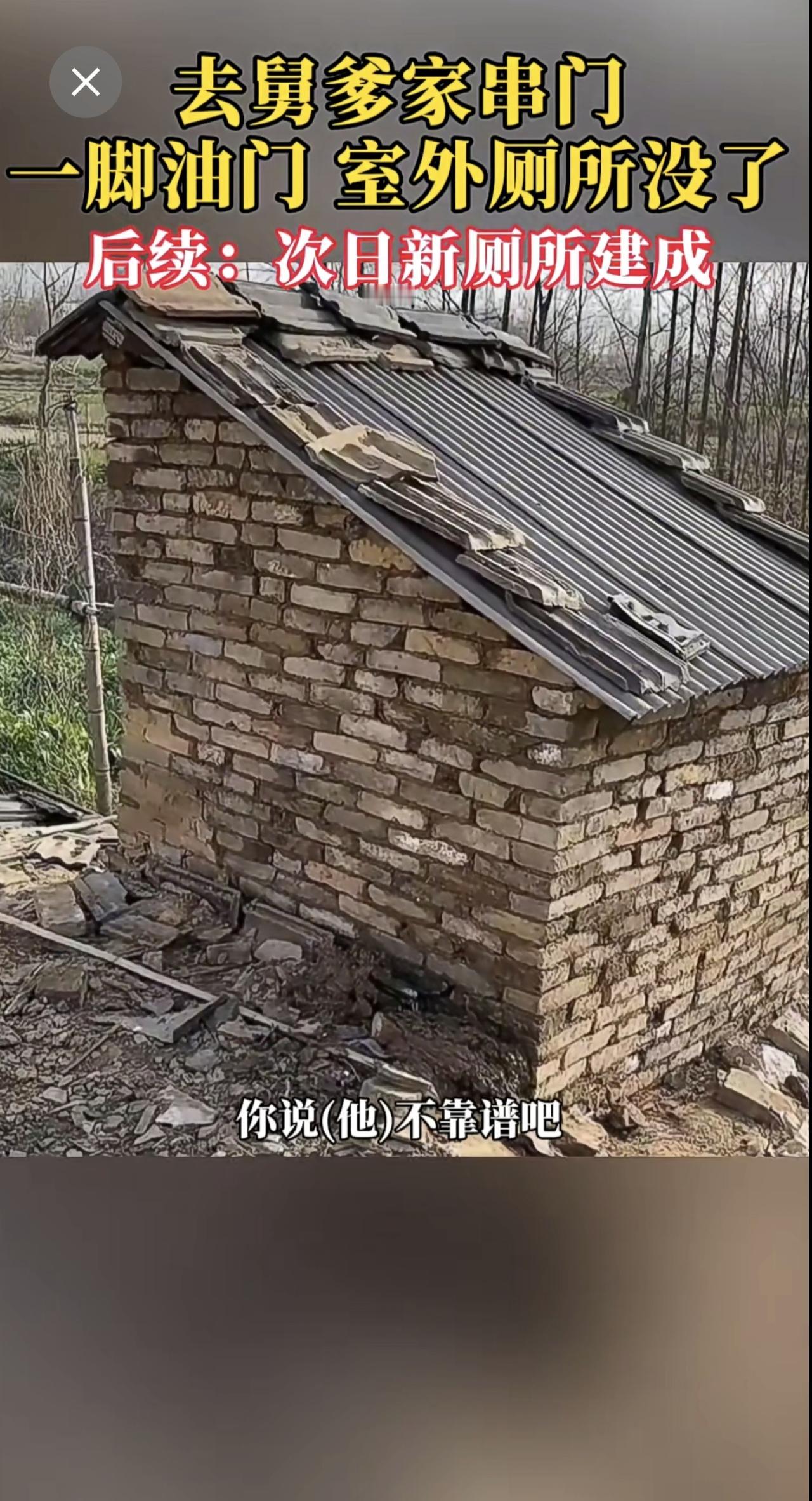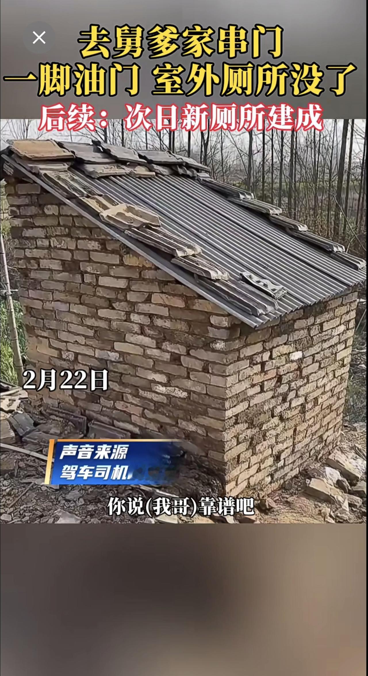 去舅爹家串门,一脚油门,室外厕所没了。后续:次日新厕所建成。 网友:舅的不去,甥的不来[捂脸][捂脸]