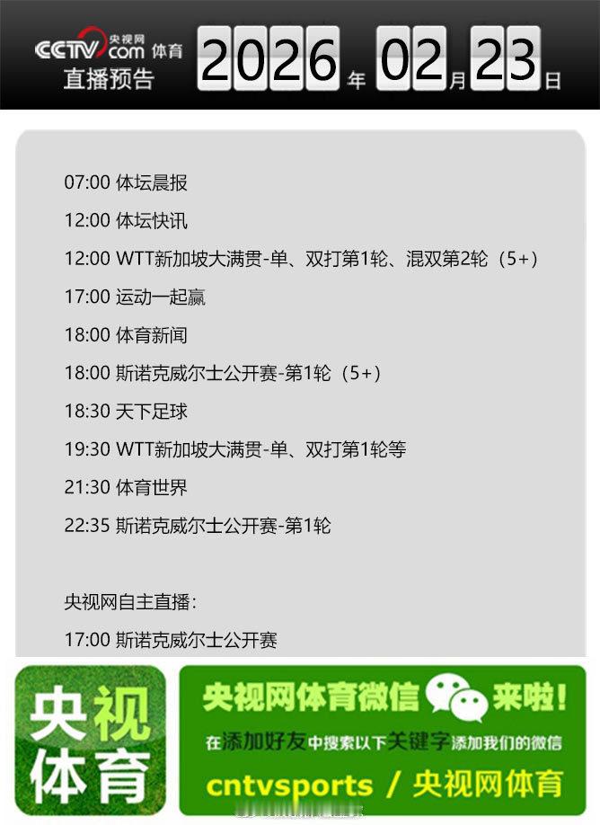 【央视网体育2月23日直播预告】07:00 体坛晨报;12:00 WTT新加坡大满贯2026 单、双打第1轮、混双第2轮(5+);17:00 运动一起赢;18:00 斯诺克威尔士公开赛-第1轮(5+);18:30 天下足球;19:30 WTT新加坡大满贯-单、双打第1轮等;21:30 体育世界;22:35 斯诺克威尔士公开赛-第1轮【更多精彩内容】(cctv.com) cr:央视网体育