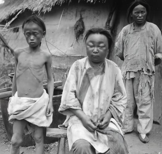 这张令人心碎的照片,记录的是晚清末一个底层家庭在生死边缘挣扎的真实场景。 女子脸部严重浮肿、眼睛几乎无法睁开,这并非过敏,而是营养不良性水肿,也叫“饿肿”。在长期饥饿的情况下,身体严重缺乏蛋白质,导致血浆渗透压下降,水分从血管渗入组织间隙,从而造成全身性的浮肿,尤其在面部和下肢表现明显。 旁边的孩子则呈现出另一种极端——骨瘦如柴,肋骨清晰可见。这是因为儿童在饥饿时,身体会优先消耗自身的脂肪和肌肉来维持生命,最终导致严重的消瘦和发育停滞。 这张照片是晚清社会的一个缩影。当时内忧外患,加上频繁的自然灾害,导致粮食极度匮乏,上千万百姓沦为灾民,在饥饿和疾病中苦苦挣扎。
