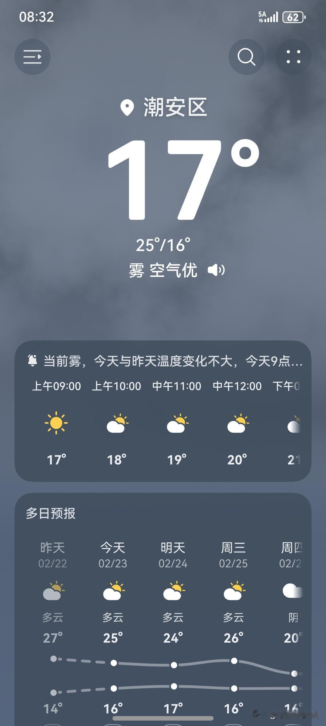 今天是2月23日,正月初七,史上最长春节假期临近尾声,明天就要上班了! 不仅我们要开工,初八广东弱冷空气开工,雨雾天气也要上线啦! 未来几天(初七~初九),广东大部云量增多,早晚有(轻)雾,北部市县有弱降水,能见度转差,假期返程注意交通安全;24日白天到夜间,有弱冷空气南下我省,中北部气温小幅下降。 今天(23日),潮州依然喜提一个多云天气,气温16~25℃,此刻气温17℃,体感温度16℃。 今天的气温虽然没有昨天那么高,但也是暖和极了!只是早晨的雾气有点重,空气比较湿润。 今天是春节假期的最后一天,多地迎来返程高峰! 受雾气影响,能见度变差,返程的小伙伴们需要注意道路交通安全,保持谨慎驾驶,时刻牢记安全第一。 今天的天气,除了早晨有雾不大好以外,其它的都还不错,依然值得一个五星好评! 如此天气!元芳,你怎么看? [捂脸][我想静静][笑哭][大笑][捂脸][我想静静][笑哭][大笑]
