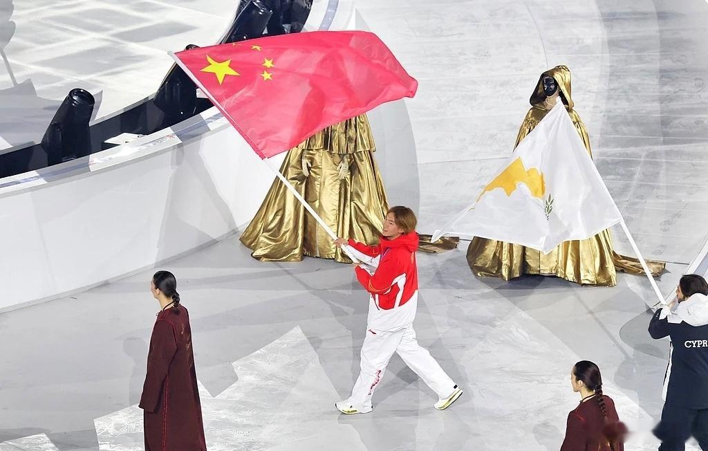 中国代表团旗手苏翊鸣手持五星红旗入场运动员入场仪式环节,各个代表团的旗帜入场。中国代表团旗手苏翊鸣手持五星红旗入场!在男子坡面障碍技巧项目上,苏翊鸣为中国代表团摘取了本届冬奥会的首金,此外,他还获得了男子大跳台的铜牌,这也是中国体育代表团在本届冬奥会取得的首枚奖牌。