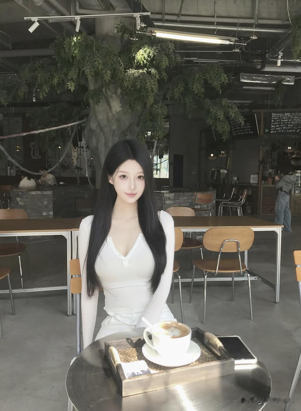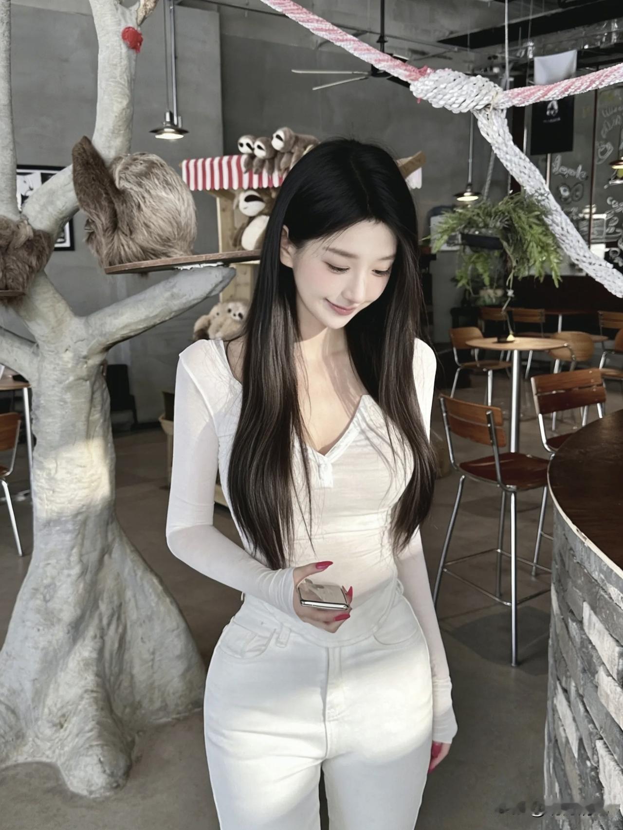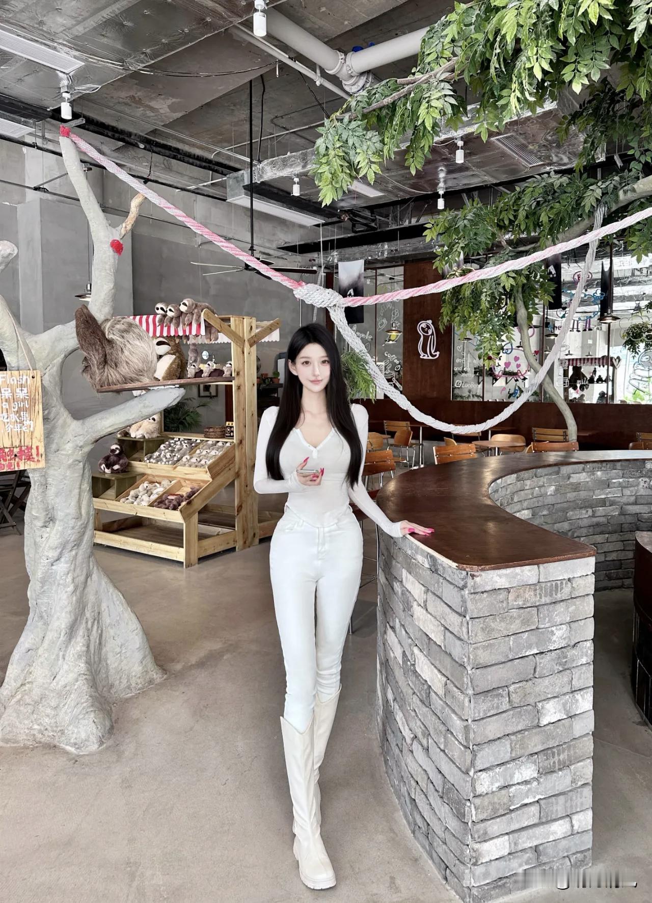 这家咖啡馆也太好拍了吧!完全是梦想中的森系空间 灰色水泥墙配木质桌椅,顶上还挂着绿植和绳网,阳光正好打在身上,光影效果绝了。今天我穿的这套意外很搭——白色长袖上衣配白色牛仔裤,在暖光里显得特别柔和干净。 最爱的还是这个动作:侧身站在树干装置旁,重心落在一条腿上,腰线自然就出来了。双手轻握手机放在胸前,红色指甲油成了全身唯一的亮色。视线稍微偏向左边,像在看树台上的玩偶,表情不用太刻意,带点好奇就够了。背后的阳光刚好切出一道斜影,树上趴着的毛绒玩偶还偷偷入镜,可爱得很。 拍照真的不用太复杂,找到一个舒服的姿势,让光线帮你说话,就是最好的出片秘诀。 集卡领红包咖啡店拍照 日常穿搭