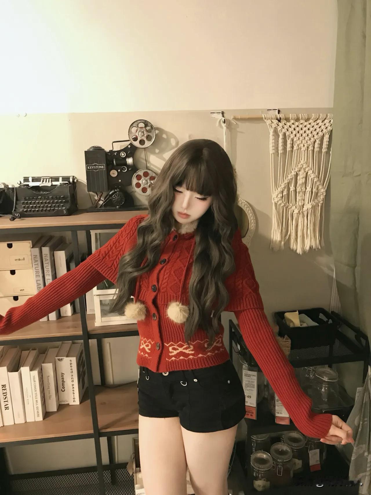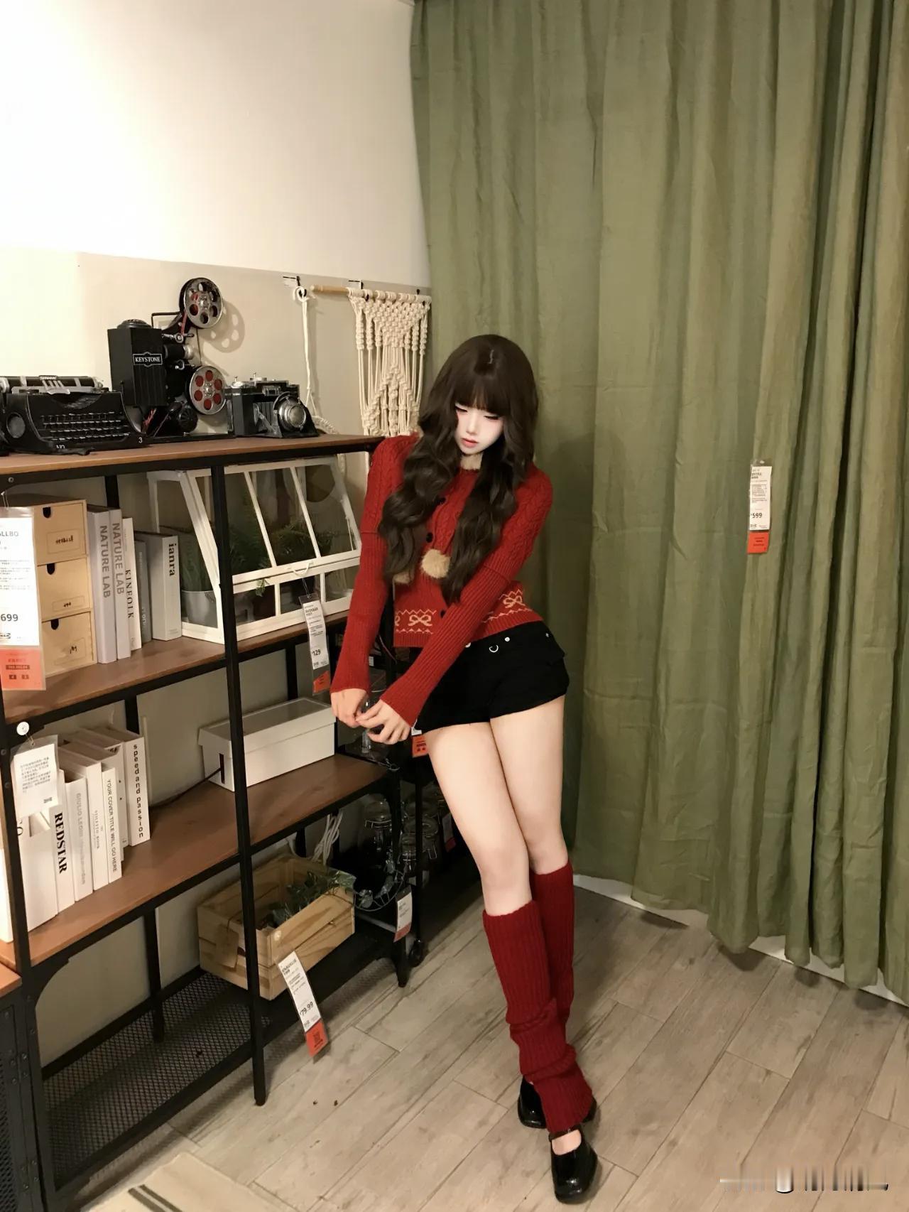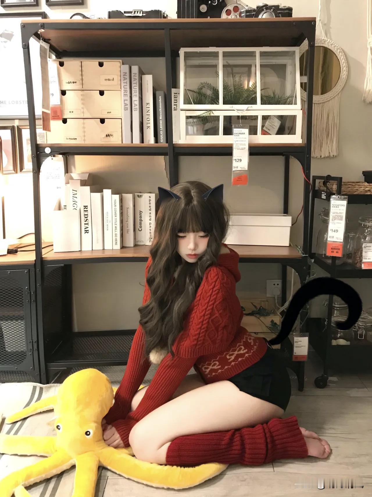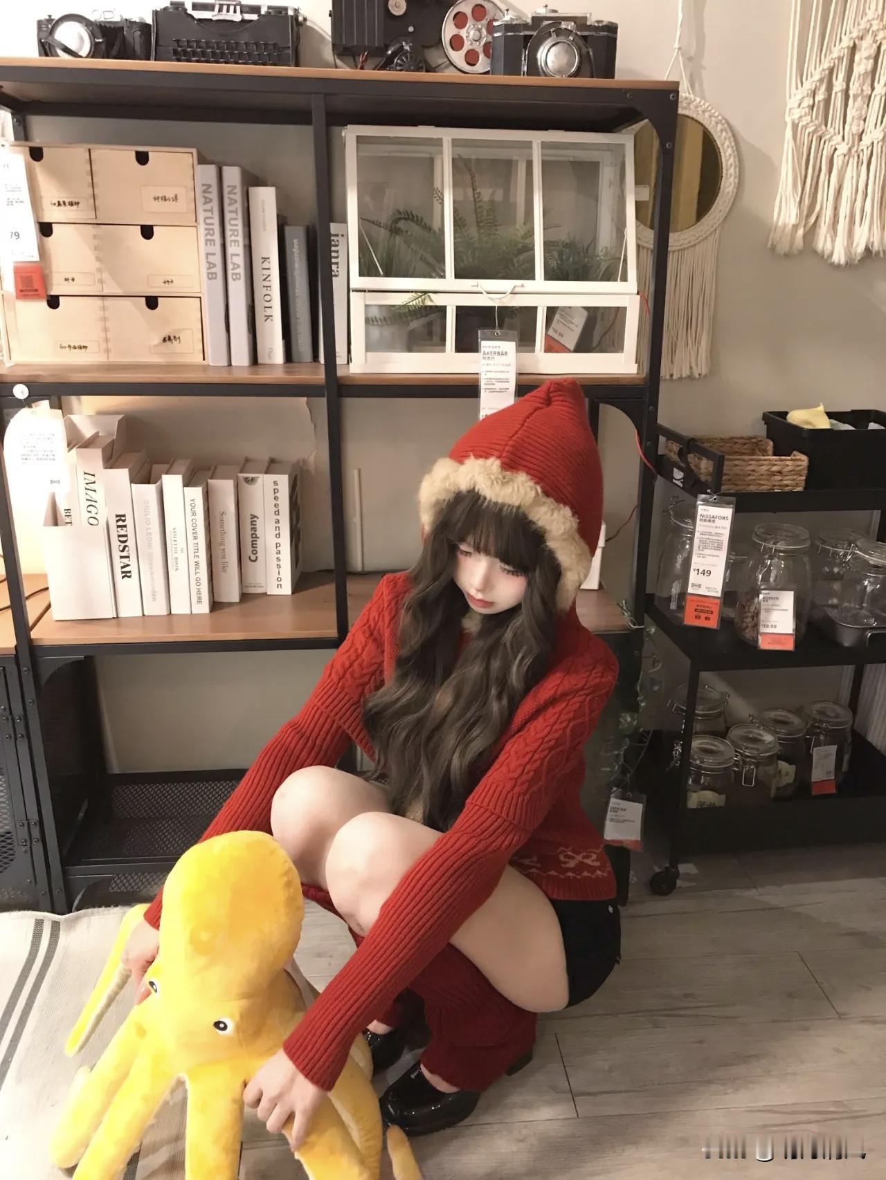 红毛衣真的是冬天拍照的神,尤其是展厅那种暖灯光下面,整个人都被衬得又软又亮。 红毛衣+黑短裤+红腿套。蹲在书架前,双手抱着一只黄色章鱼玩偶,红色毛线帽压着刘海,整个人缩成一团。暖光从左边打过来,毛衣纹理被照得茸茸的,黄章鱼一下子就把画面点亮了。 这种蹲姿真的很妙。身体前倾,重心放脚掌上,整个人看起来又乖又有点俏皮。关键是黑短裤配红腿套,露一截大腿,腿套堆出褶皱,细看还有点小性感。 我一直觉得红毛衣挺难穿的,稍不注意就显土。但你看她这样搭,黑色压住了红的跳,短裤露出腿套又增加层次,蹲在那儿抱着玩偶,画面又暖又有故事感。 你们平时拍室内暖调照片,最爱穿什么颜色的衣服? 晒图笔记大赛