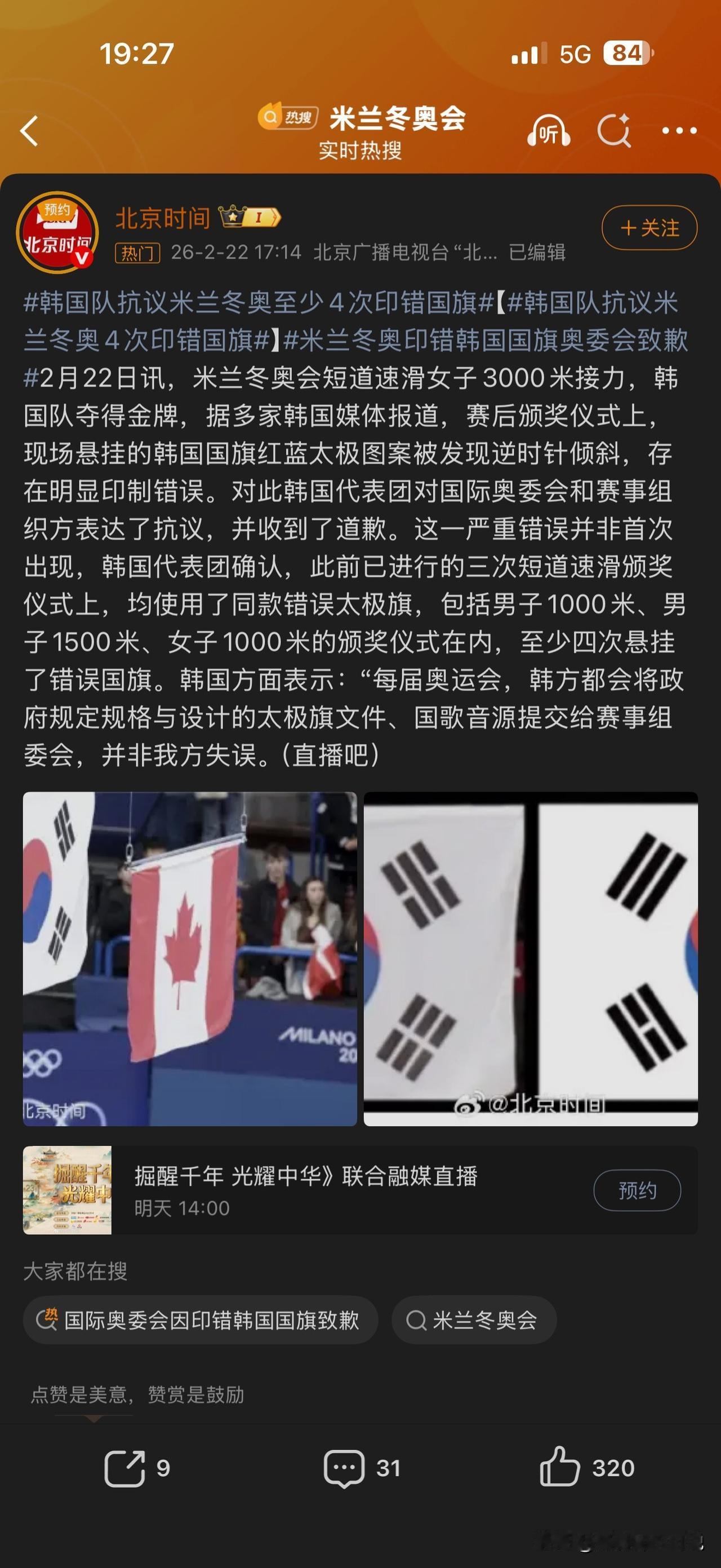 韩国网友又觉得自己在冬奥会上受辱了,原因很简单,就是因为其国旗被主办方印错了四次