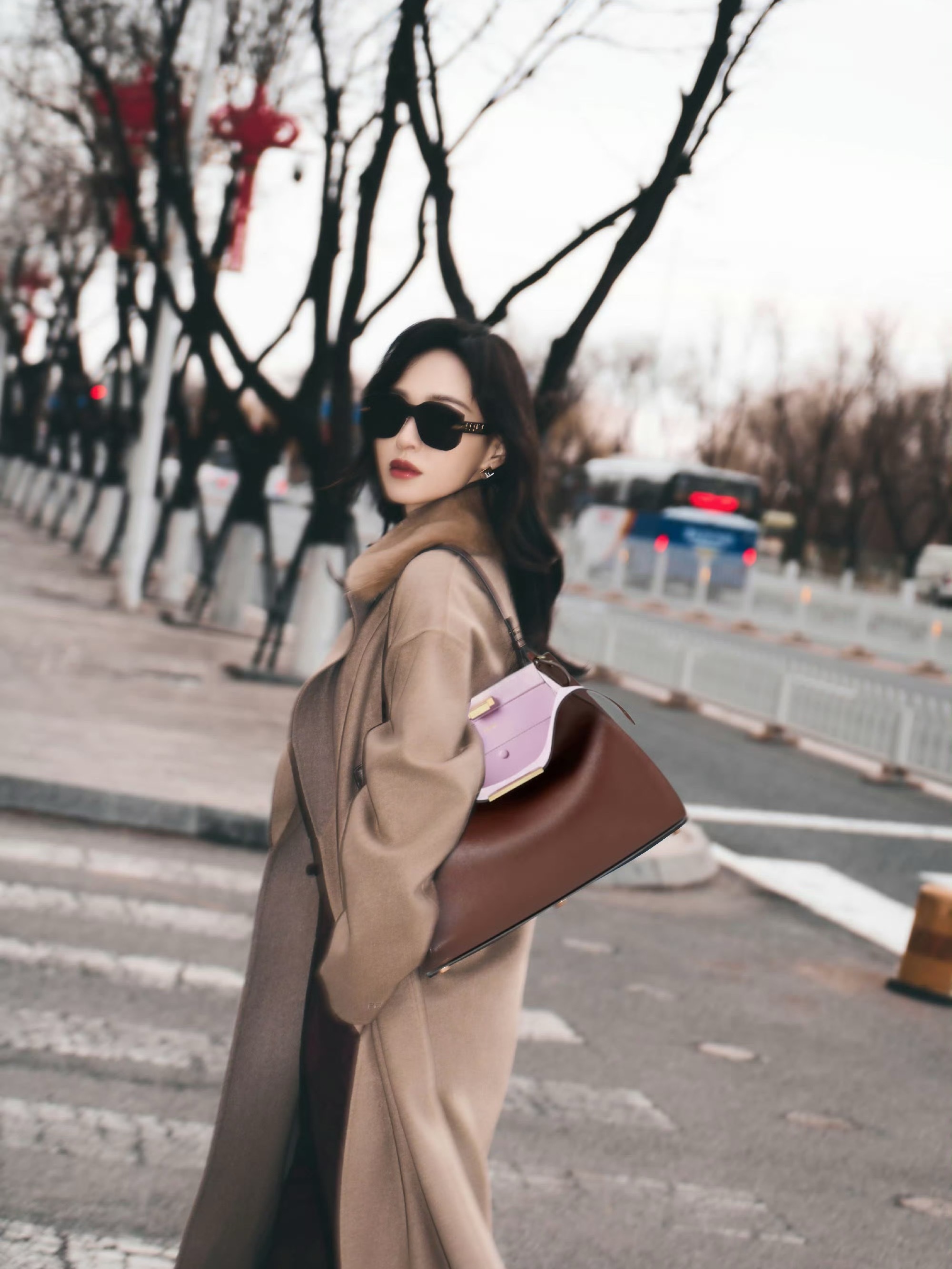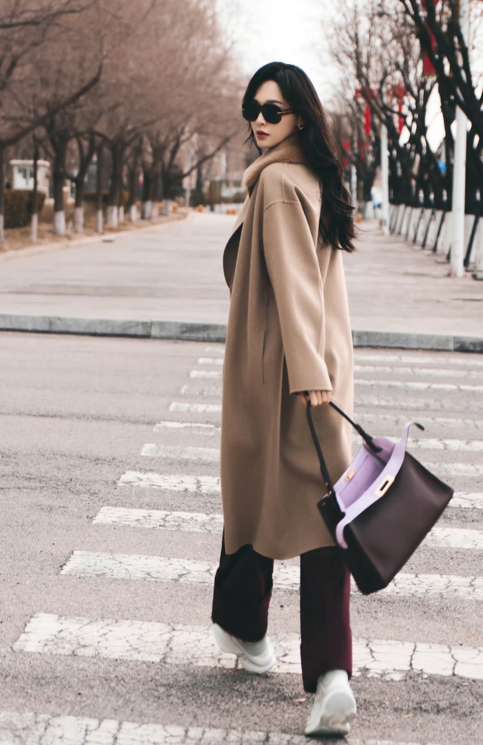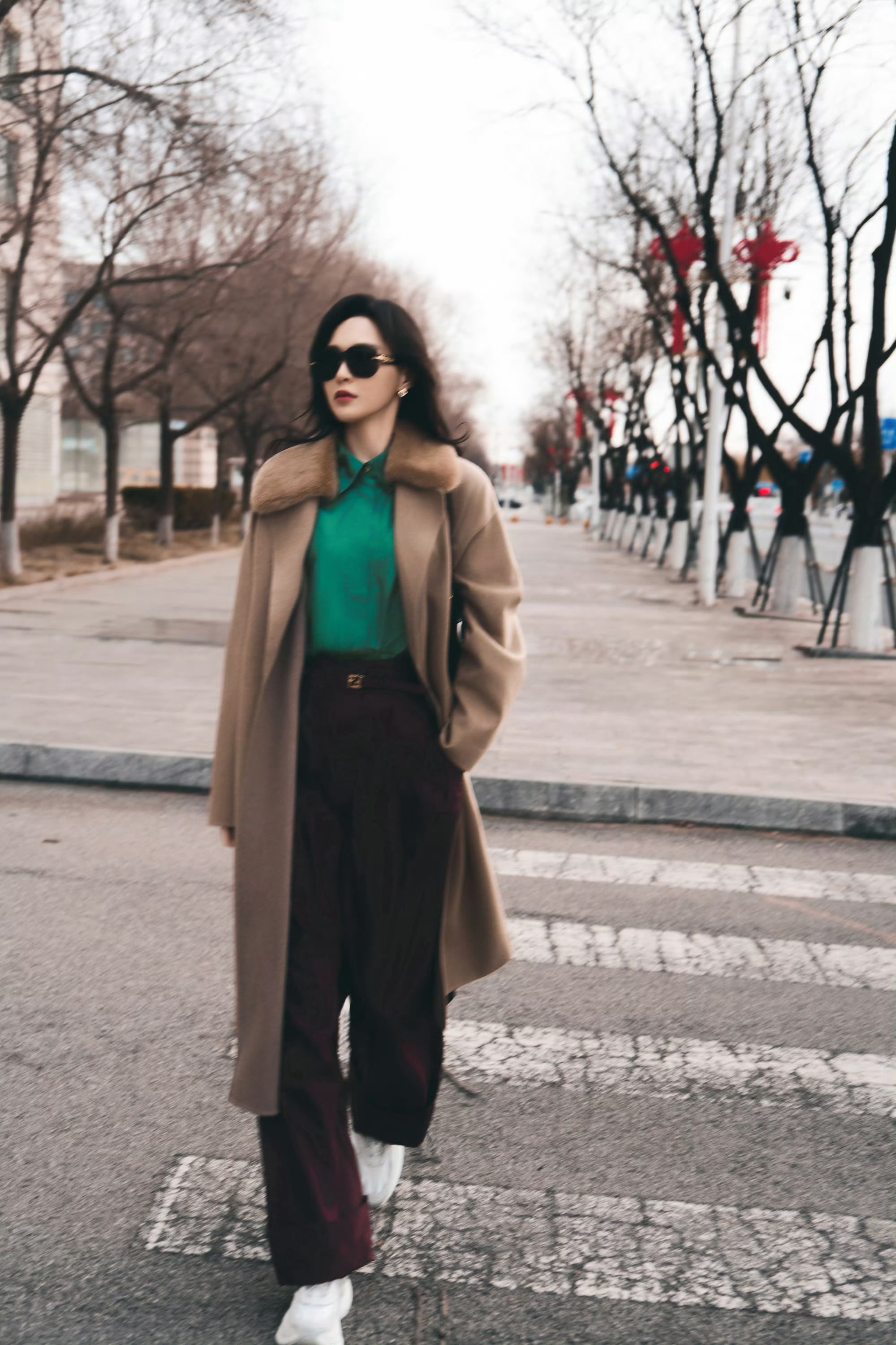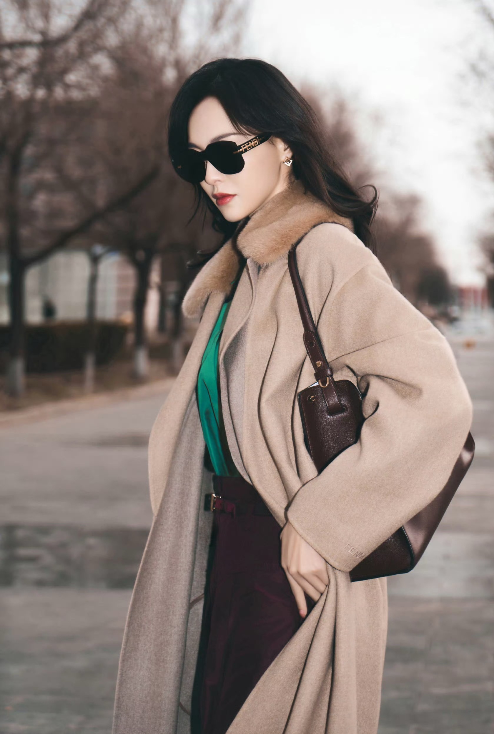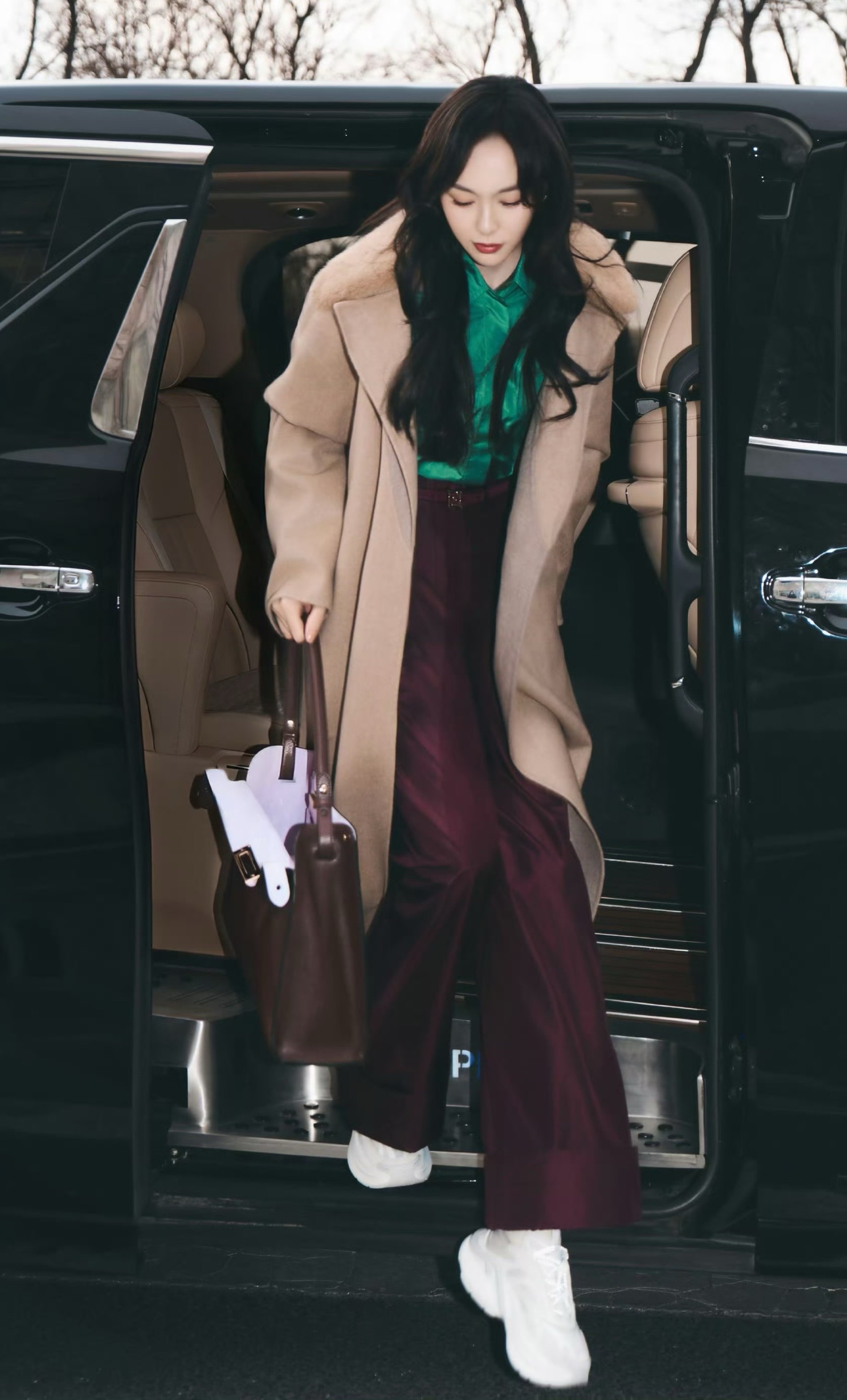 唐嫣 米兰时装周出发造型:身穿驼色大衣,内搭亮绿衬衫大胆提色,酒红的阔腿裤形。整体造型非常摩登。