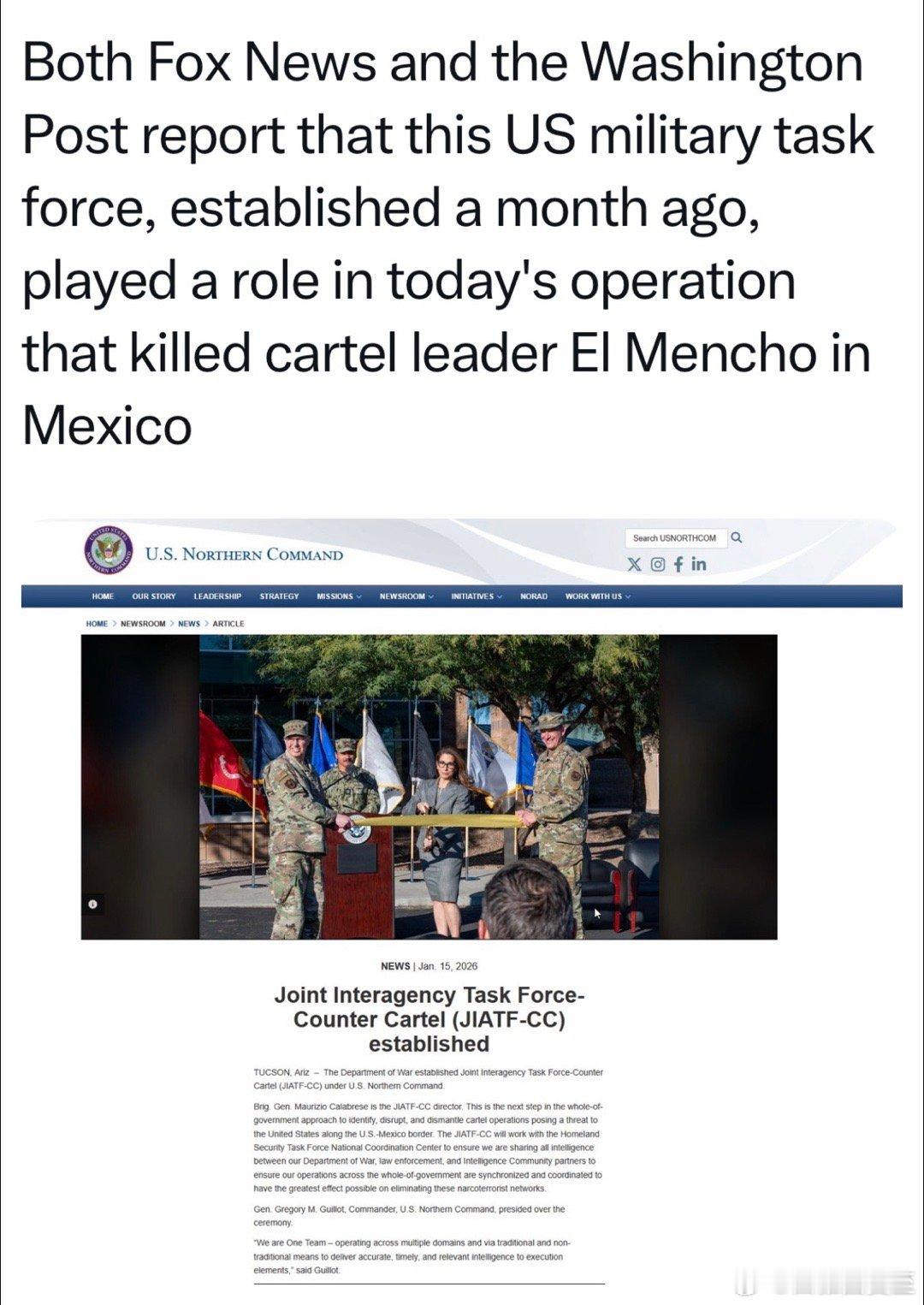美军一月成立的“美墨联合缉毒工作组”,为墨西哥军方提供情报和技术,墨西哥特种部队今天实施行动,击毙了大毒枭