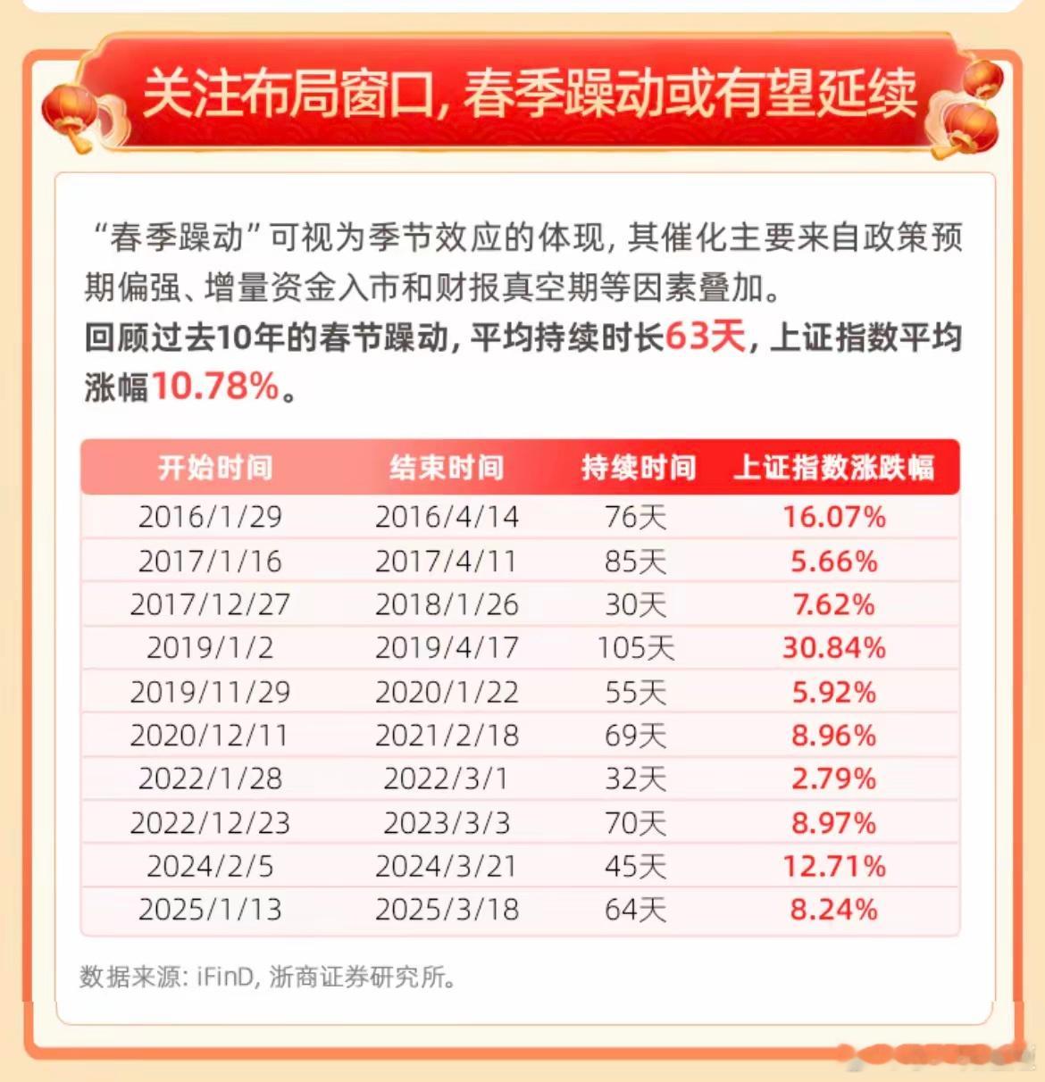 近十年,节后一周上涨概率为70% 。………………………………………为何总会出现“春燥”行情呢?1、政策端:重要会议与政策密集期,易出现新机会。2、资金端:银行“开门红〞,流动性充裕,资金活跃度大幅提升。3、业绩端:企业"业绩真空期”,市场博弈及主题投资机会增多。………………………………………….关注布局窗口,春季躁动或有望延续 。“春季躁动〞可视为季节效应的体现,其催化主要来自政策预期偏强、增量资金入市和财报真空期等因素叠加。 回顾过去10年的春节躁动,平均持续时长63天,上证指数平均涨幅10.78 %。………………………………………..A股节前已经调整过,这个时间段无论外围涨跌,A股节后继续大跌的可能性几乎没有。如果今日港股上涨,那么明天A股大概率开门红!…………………………………………
