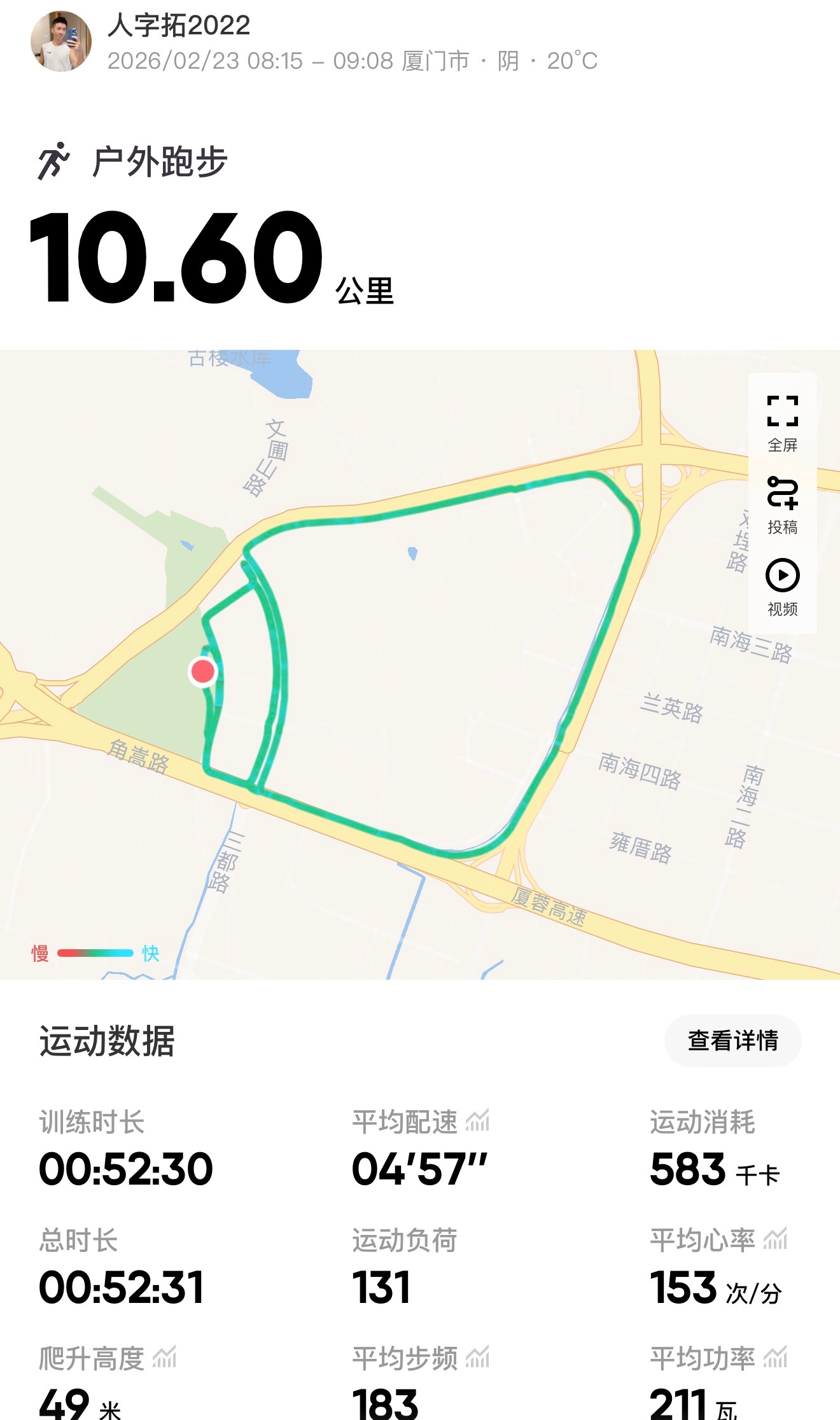 反思了一下确实跑的时候也能感觉到体感不好,一来是昨晚喝酒,二是睡眠不够,还好今天压着速度跑,行吧,凡事还是以健康第一为准,不要过度透支身体 厦门