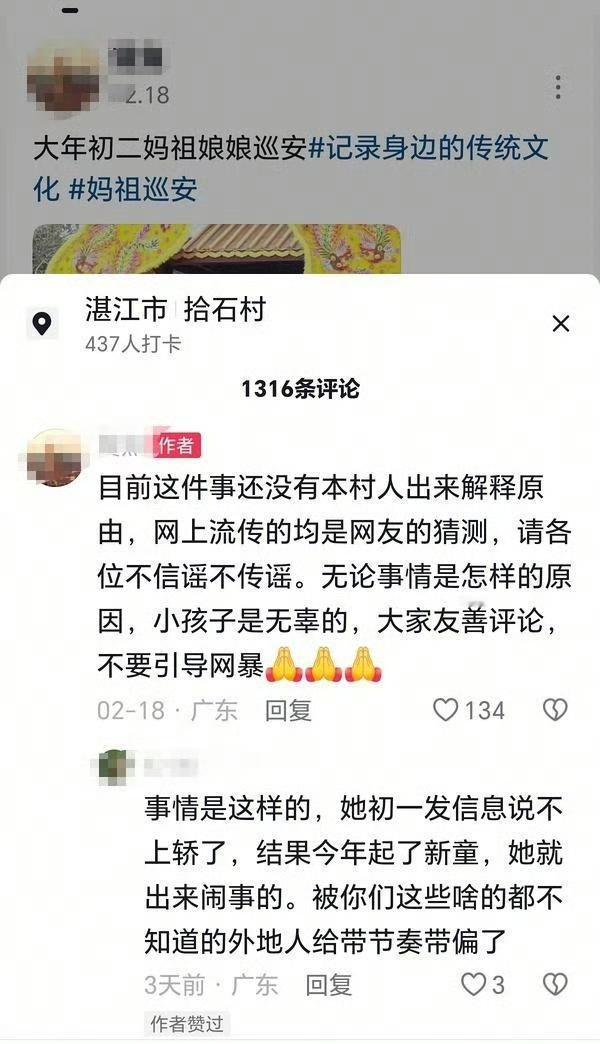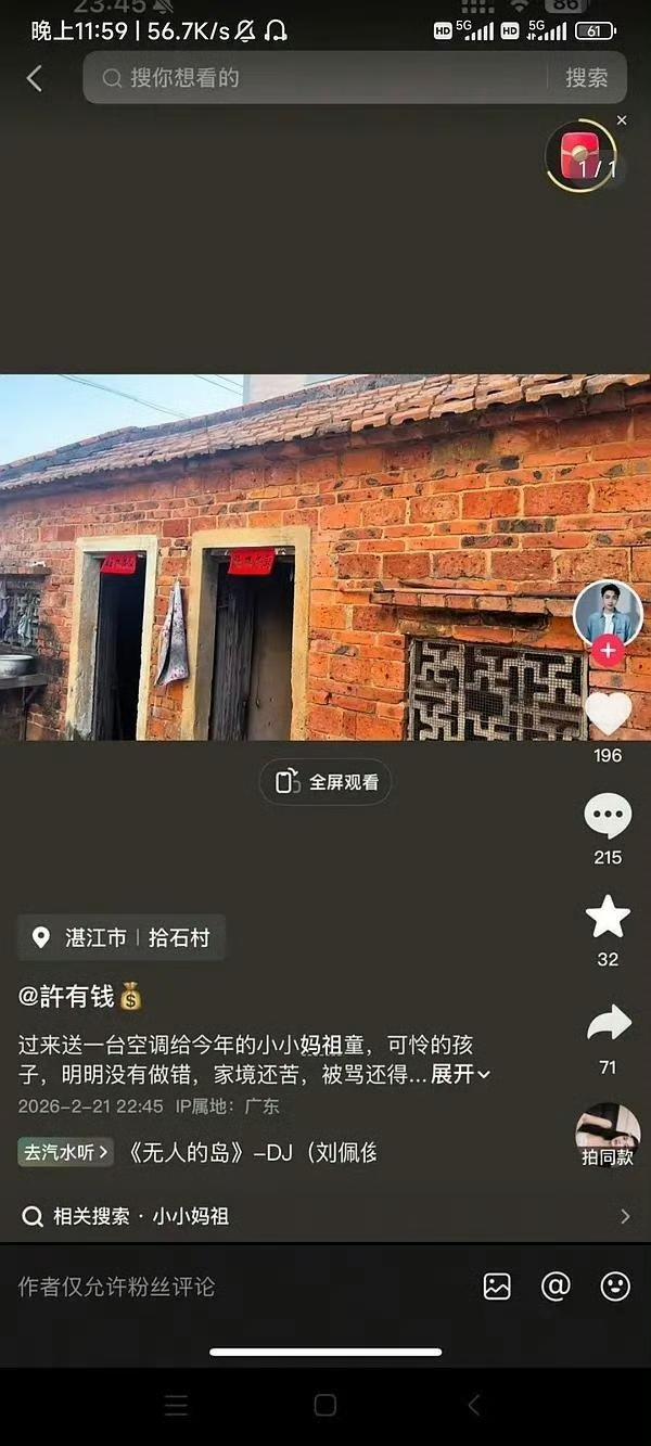 到现在还在坚信小乩童是男孩的,湛江穷人家的小女孩本就有留短发的习惯,来好好看看,图一是谁?认识不?这是近几十年最知名的湛江女孩。 图二是新乩童许某涵的家,平时就住村里,在村里属于比较穷的。而十七岁的老乩童,平时是住城里的,家境比新乩童好得多,长达六年霸占乩童位置,这次靠这事谣言起号成功,穷人家哪有这手段? 现在老乩童已经起号成功成大网红了,她敢不敢说新乩童是男孩?