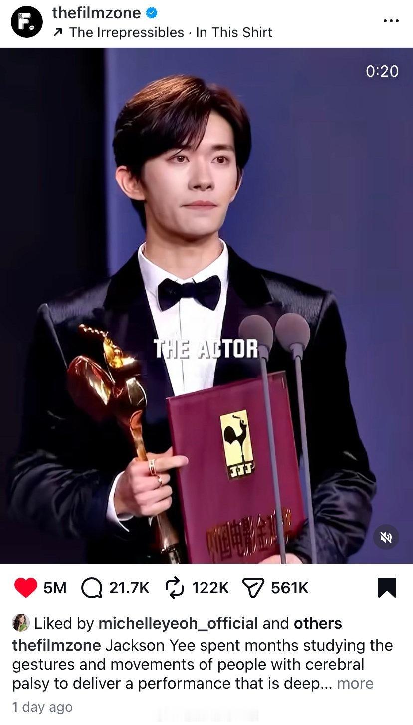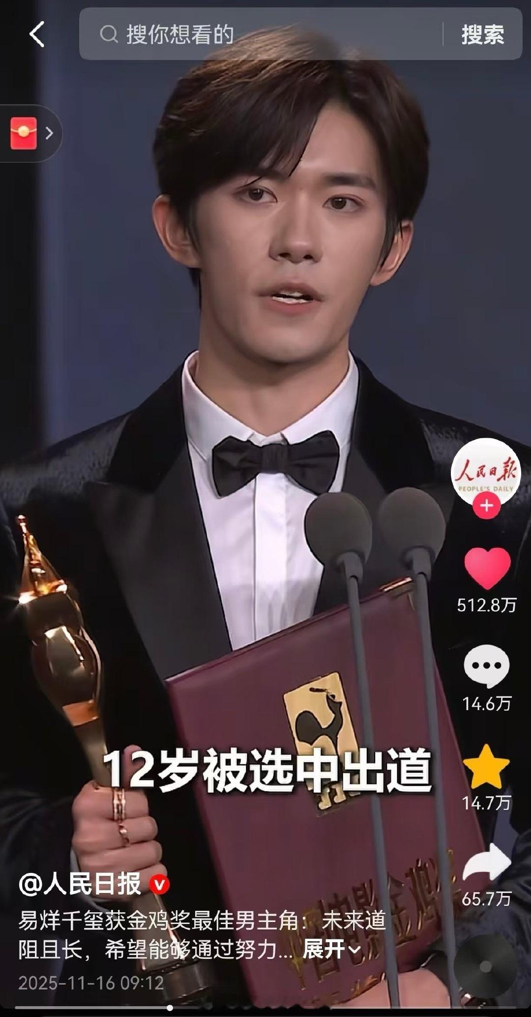易烊千玺金鸡影帝获奖视频和《小小的我》切片在外网社媒爆了,内外网均500w赞,还有好多海外名人点了🔥