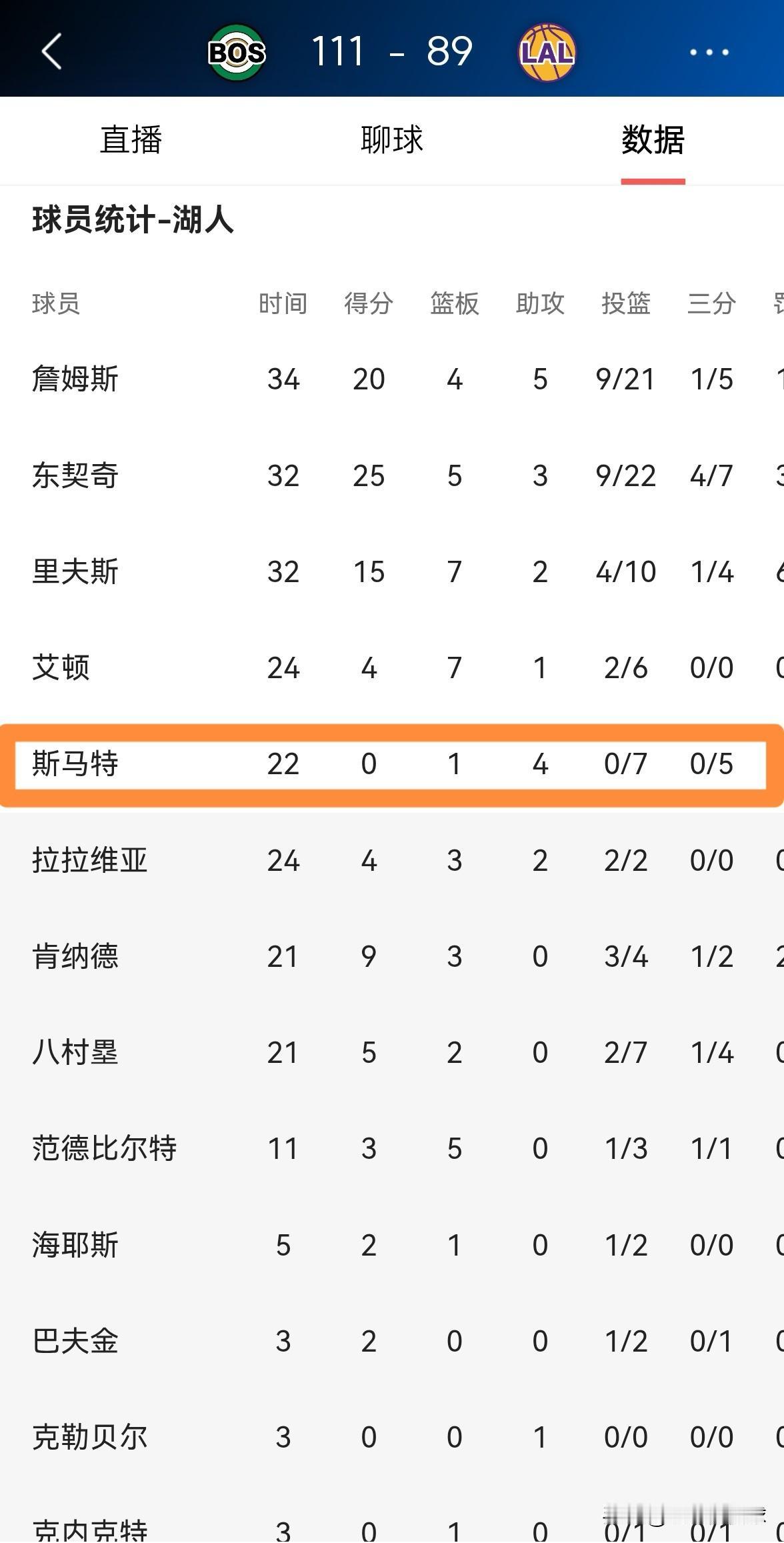 我强烈建议湖人主帅雷迪克弃用斯玛特!在今天湖人主场以89:111惨败于凯尔特人的比赛中,斯玛特打出了一场灾难级别的表现。 全场比赛下来,斯玛特首发出战22分钟,投篮7中0,其中三分球5中0怒砍0分,出现了4次犯规和1次技术犯规。 试问像斯玛特这种对球队毫无贡献的球员,雷迪克教练还有继续重用他的必要吗?