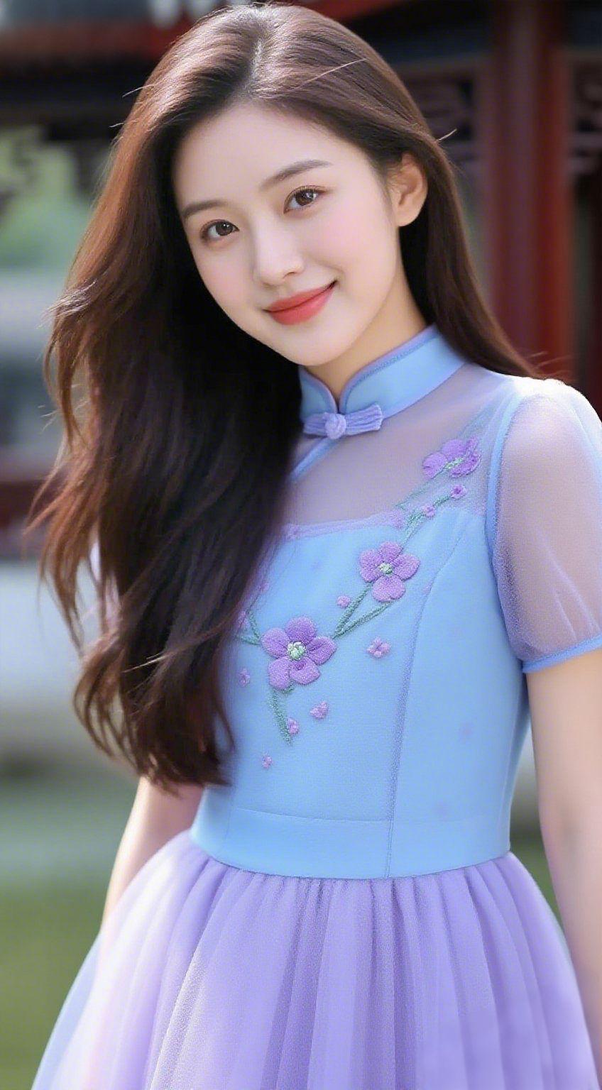 春亭紫裳沐清风 浅蓝立领配雅致盘扣,紫花点缀薄纱衣身,淡紫裙摆轻盈垂落。她站在古亭边,眉眼舒展,笑意澄澈,与身旁的春日绿意相融。 清风徐来,裹挟着花草的清甜,时光仿佛在此刻慢了下来。这份不加修饰的清雅,尽显东方气韵的恬淡美好。身处这般景致,满心皆是安宁,只觉春日温柔,岁月可亲。