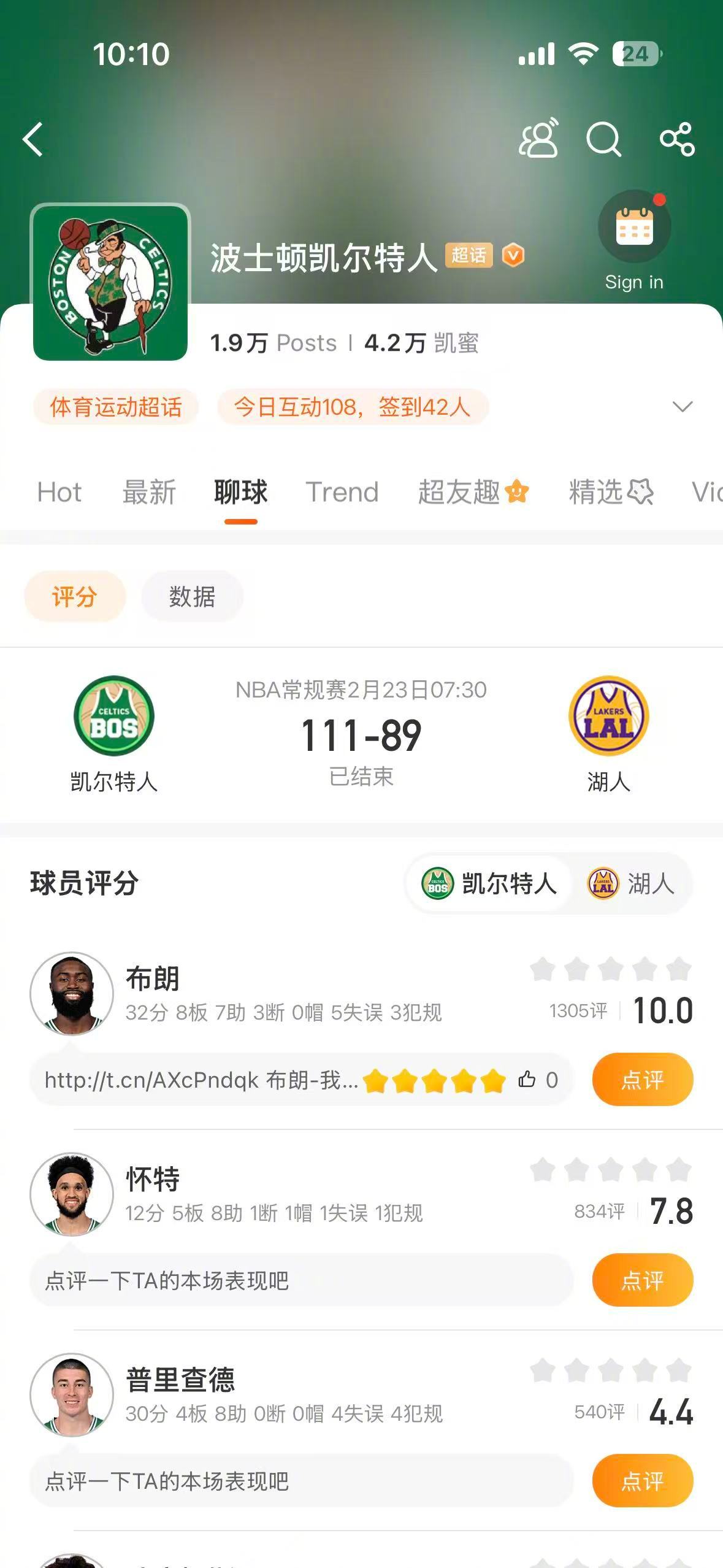 凯尔特人111-89大胜湖人,湖人遭遇对手双杀!砍下32分,詹姆斯生涯43000分里程悲,25分。点击进入洛杉矶湖人 和波士顿凯尔特人 ,为两支球队的球员们打分吧!杰伦布朗32分