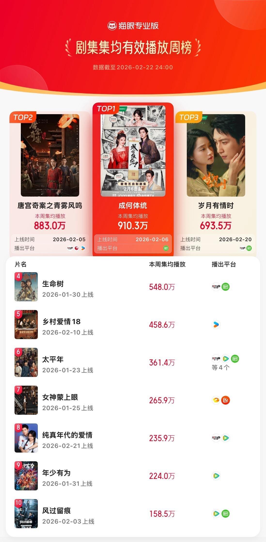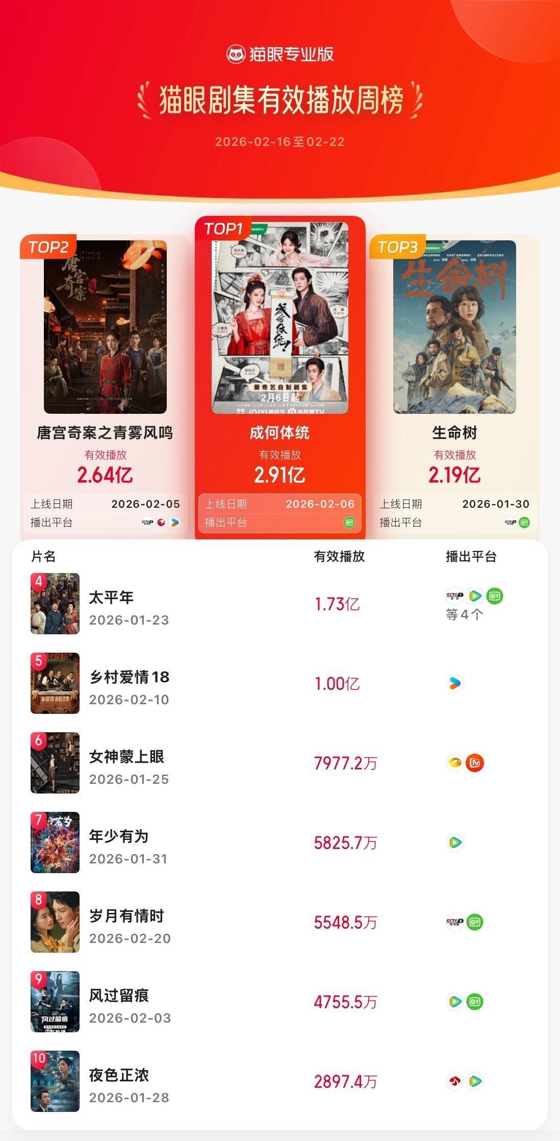 成何体统三榜霸榜 据猫眼专业版数据,领衔主演《成何体统》三榜霸榜!分别获得剧集热度、剧集有效播放和剧集集均有效播放周榜冠军🏆