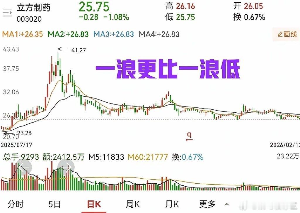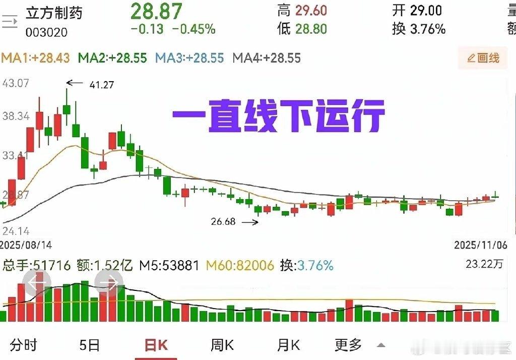 对于这种走势,我要说的是三个字:“不要碰”。一定不要碰!总有人要抄底,对于什么均线之类的毫不在意,有人抄底还有诀窍,说越跌越买,这是什么样的战法,我不太明白。我只知道破位要跑,不能留恋。趋势一旦形成,一般不会在短期内扭转,上涨趋势也好,下跌趋势也罢,基本没有可能一下子就转变的。当然也有特殊情况,突发消息刺激的,连续一字板,那只是个别。立方制药这样的走势,下跌过程中,没有办法知道什么时候是底,所以尽量不要盲目补仓,只能等待趋势扭转。特别提醒:贴图欣赏,并非推荐,据此操作,风险自担。