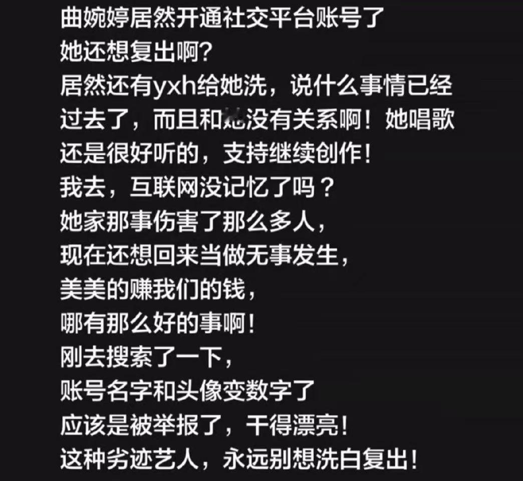 曲婉婷尝试复出失败,先是评论区被冲,目前账号已经找不到,从开通到消失不到24小时