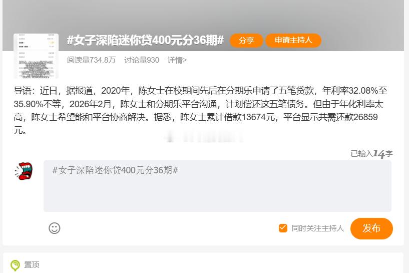 女子深陷迷你贷400元分36期 “年利率32.08%至35.90%不等”所以呀,打打杀杀没有技术含量,放贷来钱多快呀女子深陷迷你贷借1万3要还2万6 ,消费陷阱一夜返贫,热点观点