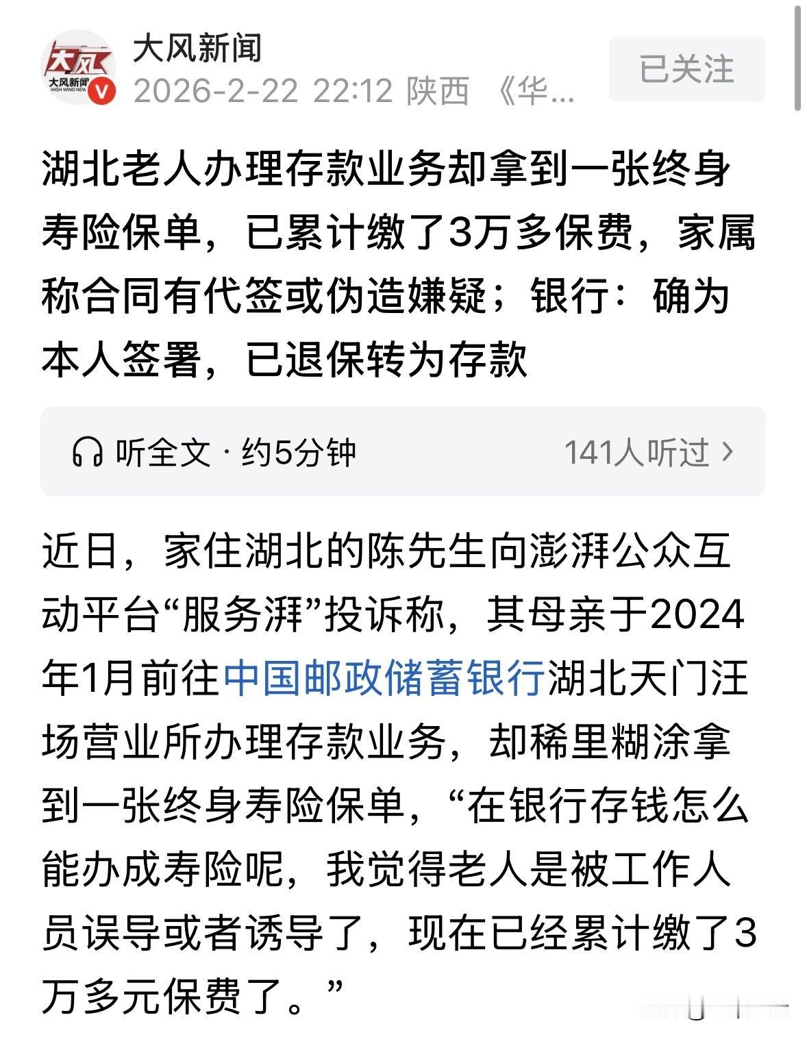 湖北,68岁老人去银行办理存款业务,工作人员热情接待,告诉她存定期利息太低了,现在有个内部福利,利息高,存5年期满可以连本带利取出,还送一桶油。老人一听,心动了,稀里糊涂签了字,浑然不知工作人员给她办的是要交5年、死后才能赔的寿险,截至儿子发现,老人已经缴了3万多保费,而合同上的一些细节,让儿子怀疑这份合同是伪造代签的。 2026年刚开年,68岁的陈奶奶心里就装了一桩事儿,让她整夜整夜睡不着。 她平常刷手机短视频,总看到“老年人存款被骗”的新闻,越看越心慌,总觉得自己掏出去的那笔钱也出了问题。 实在扛不住了,她才给儿子陈先生打了电话,还拍了张照片传过去,说:儿啊,你帮妈看看,这到底是存单还是保单? 陈先生一看照片,脑瓜子嗡嗡的。那根本不是什么银行存单,而是一份保险的取款凭证。 更让他炸毛的是,这事儿母亲居然瞒了家里整整2年。 时间倒回2024年1月5号。 那天天冷,陈奶奶揣着攒了好久的1万块现金,想去镇上的邮储银行存个定期,图个踏实。 柜台里的工作人员热情得很,一听老人要存钱,立马推荐了一个“好产品”。 工作人员说:阿姨,存定期利息太低了,我们这有个内部福利,利息高,存5年还送一桶油! 陈奶奶文化程度不高,一听“利息高”还有“送油”,立马心动了。 工作人员接着说:您放心,跟存款一样,5年期满拿着这张‘凭证’就能取钱,连本带利! 在一连串的保证和那桶油的诱惑下,老人迷迷糊糊就签了字。 她后来回忆,当时只觉得是换了个利息高的存款方式,压根不知道自己买的是一份要交5年、只有人死了才能赔的寿险。 这一瞒,就是2年。直到2026年,陈先生才从母亲嘴里拼凑出真相。 他调出电子合同一看,那合同里母亲的年收入填的是8万,家庭年收入10万,身高160体重60公斤。 可实际上,母亲个子不到150,瘦瘦小小,也没有固定收入,全靠儿女给的生活费。 更离谱的是,合同上的签名虽然是母亲的名字,但字迹工整得像印刷体,跟母亲平时那歪歪扭扭的笔迹压根对不上。 陈先生当即就点破,说我妈平时连笔都很少拿,这字一看就不是她写的,要么是代签,要么是照着描的! 他们也不是没想过要退保,可这退保的代价让家里人头疼不已。 陈奶奶在2025年、2026年交保费前夕,都去银行说“不想办了”,可工作人员一句话就把老人堵了回去:现在退只能拿回几千块,亏大了! 老人一听要亏本金,心疼得不行,只能硬着头皮继续缴费。 陈先生拿着现金价值表算了笔账。就算熬满5年,连本带利也就拿回5万零950块。 折腾5年,一万块本金就赚950块?这叫什么高息?分明是坑! 陈先生拿着这些疑点找到了银行。面对“收入造假”、“疑似代签”的质问,银行工作人员一开始咬定流程合规,说有录音录像证明当时告知了是保险,签名也比对过了。 但当陈先生把“送油”、“高息诱导”、“老人无收入”这些硬伤摆在台面上,尤其是指出保单信息严重失实可能涉及违规销售时,银行的态度软了下来。 2月6号,在陈先生的据理力争和媒体的介入下,银行终于松了口。 双方达成一致:全额退保!3万块钱一分不少退回来,直接转成定期存款。 拿到退款的那一刻,陈奶奶紧锁了两年的眉头终于舒展开了。但这事儿给陈先生留下的阴影却没散去。 他后怕地想,如果母亲没在网上看到那些诈骗新闻,如果自己没发现那些错得离谱的保单信息,这3万块是不是就真打水漂了? 银行虽然把钱退了,但对于“为什么保单信息全是错的”、“是不是真的代签”这些核心问题,始终没给个痛快话,只说是“还在核实”。 那从法律角度怎么看这件事? 《保险法》第131条规定:保险代理人、保险经纪人及其从业人员在办理保险业务活动中不得有下列行为:欺骗保险人、投保人、被保险人或者受益人;隐瞒与保险合同有关的重要情况;阻碍投保人履行本法规定的如实告知义务,或者诱导其不履行本法规定的如实告知义务…… 陈奶奶的经历,是典型的银行保险销售误导行为,严重违反了《保险法》关于诚信义务的规定。 首先,工作人员以“高息存款”、“送食用油”为诱饵,将终身寿险伪装成定期储蓄,且承诺“五年期满拿着凭证就能取钱”,刻意隐瞒了“退保有巨额损失”及“身故才赔付”的核心合同条款,构成了法条中明确禁止的“欺骗投保人”和“隐瞒与保险合同有关的重要情况”。 其次,保单中填写的老人年收入、身高体重等信息与实际严重不符,且签名疑似代签,这不仅违反了“如实告知”的义务,更涉嫌阻碍投保人履行如实告知义务。 对于68岁且无固定收入的老人,将不具备保费支付能力的复杂寿险产品销售给她,明显违背了金融机构应尽的“适当性管理”义务。 虽然银行声称有“双录”证明合规,但信息造假和诱导性销售的事实客观存在。 对于这件事,你怎么看? 欢迎关注@一案一论