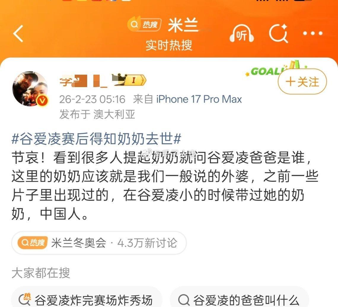 谷爱凌奶奶去世人家说的是奶奶,中文采访也是说的奶奶,非得给人改称呼这是在?谷爱凌