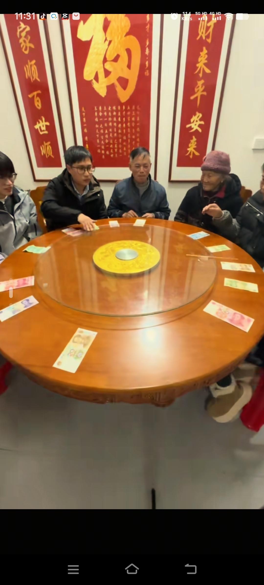 梁志辉家昨天为他过完生日后,全家人玩起了一个抓钱游戏。他们把不同面值的钱摆在餐桌上,还在桌上用胶带粘了一根筷子当作指针。转动上面的转盘时,筷子指向哪张人民币,谁就能获得那张钱。梁志辉的弟弟不愧是985高校毕业的高材生,连续两次都抓到了红色面值100的钱,评论区都夸他智商在线。一家人聚在一起,真的十分开心,其乐融融。