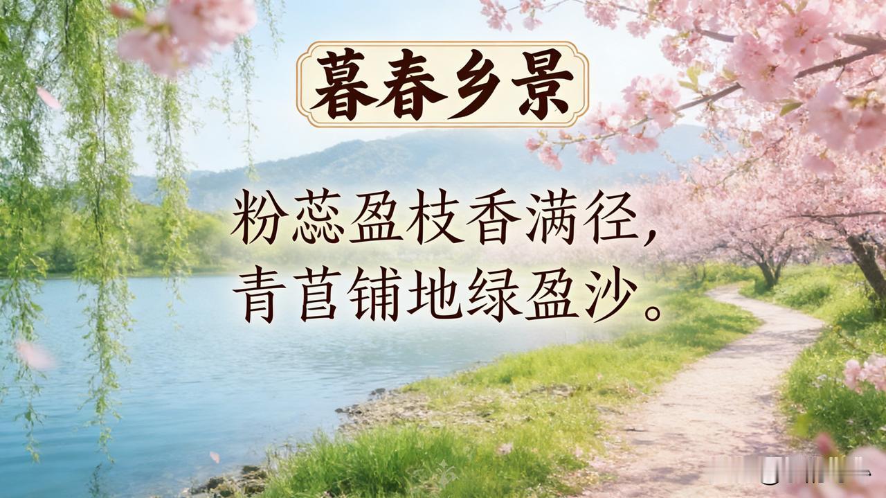 《暮春乡景》乐韵诗心原创诗词: 暮春乡野绽芳华, 翠影摇风映碧涯。 粉蕊盈枝香满径, 青荑铺地绿盈沙。 溪流潺缓歌新曲, 农叟悠然赏落霞。 最喜此间尘虑远, 桃源胜境梦魂赊。 这首诗词描绘暮春乡村美景。首联点明时节与地点,展现乡村芳华初绽之景。颔联写繁花满径、绿草盈沙,色彩明艳。颈联中溪流欢歌、农人赏霞,尽显悠然。尾联直抒胸臆,表达对这远离尘世、宛如桃源的乡村景色的喜爱与沉醉。