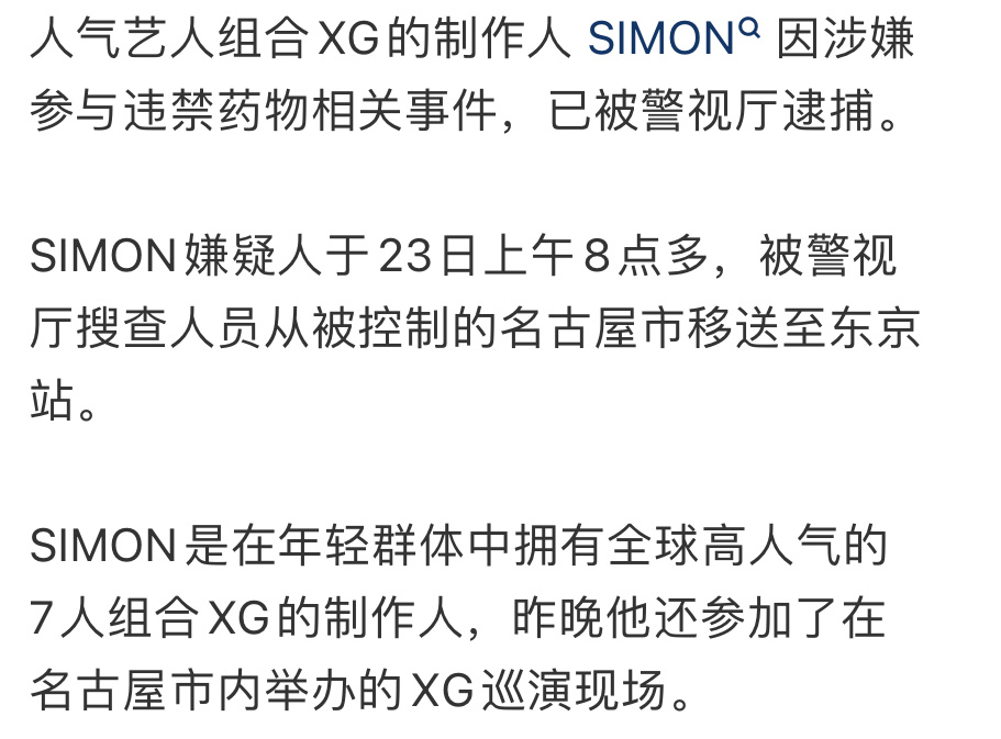 XG制作人被逮捕XG制作人SIMON被逮捕,涉嫌参与违/禁药品相关事件。