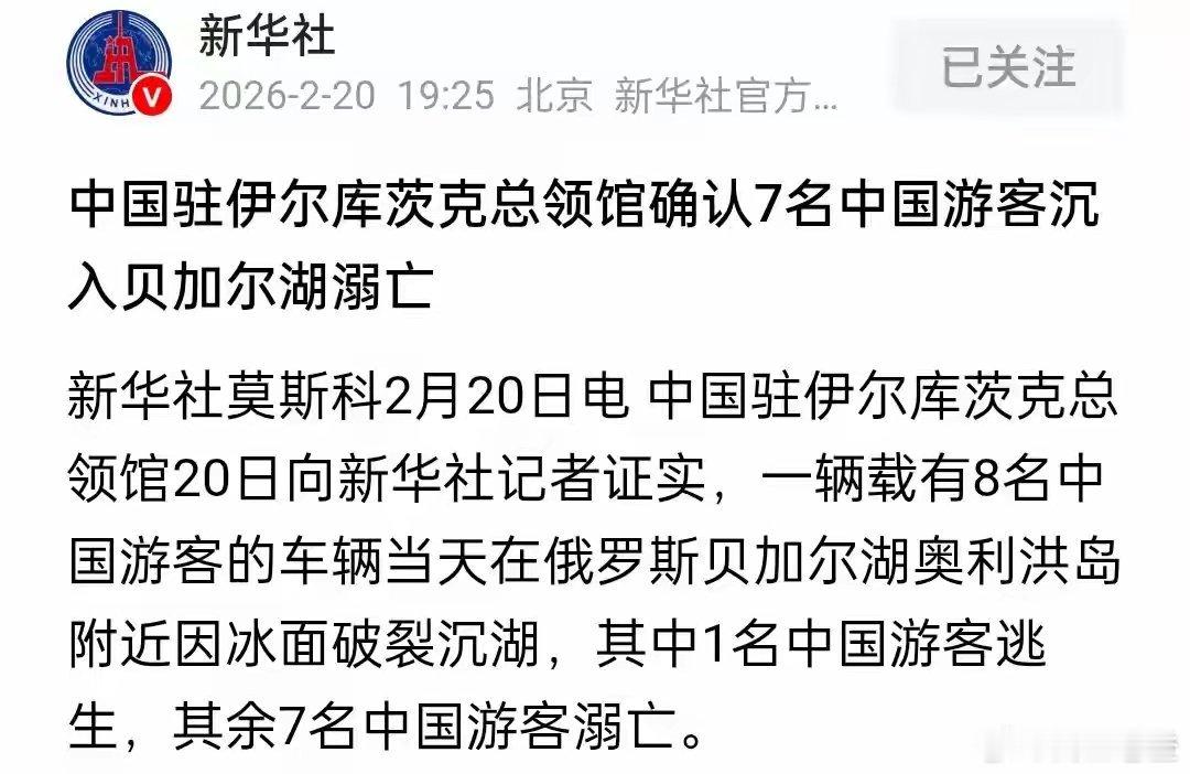 7名中国游客贝加尔湖溺亡!这湖水若平摊到全中国,平均水深2.4米李健的一首《贝加尔湖畔》,让这片冰封时蓝冰碎玉、碧波时澄澈如镜的湖泊成了无数游客的梦中胜地,可谁也没想到,这份极致的美背后,也藏着致命的危险——2026年2月20日,俄罗斯贝加尔湖奥利洪岛“三兄弟岩”附近发生冰面坠车事故,一辆载有8名中国游客和1名俄罗斯司机的UAZ越野车因冰面破裂坠入冰窟,最终造成7名中国游客、1名司机溺亡,仅1名中国游客获救。该事件由中国驻伊尔库茨克总领馆、俄紧急情况部等官方机构证实,极目新闻、央视新闻等媒体也跟进披露了事发细节,这也是贝加尔湖一个月内发生的第二起涉中国游客的冰面安全事故。作为大汉苏武牧羊之地,大唐瀚海都督府辖区,元朝岭北行省管辖地,这片洁净的湖水一直是国人心心念念的地方,但可能很多人都没有想到,这片看似“一隅之地”的湖泊,蕴含的水量大得让人难以置信——其储水量约23万亿立方米,是我国地表淡水总量的8倍多,若是把这些水平摊在960万平方公里的中国国土上,平均水深能达到2.4米,足以没过所有人的身高。可能很多人对将贝加尔湖水平摊到我国,平均水深会有2.4米这个说法不敢相信,毕竟我国面积很大,有960万平方公里,一个湖泊的水量,平摊到这么大的面积上,怎么可能还会有2.4米深呢?还别不信,计算一下就清楚了。贝加尔湖的面积是3.15万平方公里,平均水深是730米,而我国的国土面积是960万平方公里。那么列式3.15×730÷960,等于2.3953125,约等于2.4。可能有的朋友还不理解上面的列式,那也可以用我国的国土面积除以贝加尔湖的面积,960÷3.15≈304.8,就是我国的国土面积是贝加尔湖面积的304.8倍,再将贝加尔湖的平均水深除以这个倍数,730÷304.8,也是约等于2.4,即平均水深约为2.4米。此外,还有一个算法是贝加尔湖的水量除以我国的国土面积,贝加尔湖水量约23万亿立方米,我国的国土面积960万平方公里换算成平方米为9.6万亿平方米,列式23÷9.6≈2.4,也是平均水深为2.4米。可见,将贝加尔湖的湖水平摊到全中国,它的水深仍然有2.4米,而贝加尔湖的面积只有3.15米,所以贝加尔湖的冰面之下,是730米的平均水深,最深处甚至可达1637米,如此深不可测的水域,一旦坠冰,生存概率微乎其微。而本次带有游客的旅游车辆坠入冰窟事故的发生,看似是冰面破裂的意外,实则是多重人为疏忽酿成的悲剧。当地时间2月20日下午2点多,涉事的UAZ越野车行驶至奥利洪岛“三兄弟岩”附近冰面时,冰面突然破裂,车辆在短短一分钟内便完全沉没,速度之快让车上人员几乎没有逃生时间。而事发前一天,就有游客前往该区域,发现沿途冰裂遍布,司机为避开裂缝甚至迷路,拍照时还能听到冰面开裂的声响,这片冰面早已是险象环生。更关键的是,这场悲剧本可以避免。事发路段早在2月初就已被官方禁行,前往奥利洪岛的冰上渡口也处于关闭状态,当地明确严禁车辆驶上未开放冰面,但涉事司机却无视禁令强行闯入。目击者还称,司机发现冰裂后不仅没有停车绕行,反而选择加速通过,这一操作直接导致冰面承压过大发生破裂。而追溯行程背景,涉事旅行团疑似为未注册的“黑团”,司机是非法揽客人员,其报价远低于市场价,没有正规的安全保障和应急能力,为了盈利选择了最危险的路线。这并非贝加尔湖首次因冰面行车发生事故,就在2026年1月28日,一辆载有10名中国游客的同款UAZ越野车在贝加尔湖冰面翻车,造成1名中国游客身亡、4人受伤,当时俄方就已展开刑事调查。事故发生后,中国驻伊尔库茨克总领馆在1月29日凌晨第一时间发布领事安全提醒,明确指出贝加尔湖冰面遍布肉眼难以察觉的裂缝和受压隆起,切勿乘坐车辆穿越自然冰面或未开放冰面道路,冰上交通优先选择气垫船,甚至还提醒游客甄别地接服务资质,拒绝非法运营车辆 。但遗憾的是,这份预警并未被足够重视,最终酿成了更惨重的后果。为何贝加尔湖的冰面看似坚固,却如此危险?这和它的地理特征息息相关。贝加尔湖是世界上最深的淡水湖,平均水深730米,部分区域水深超1600米,即便冬季湖面会结上1米多厚的冰层,甚至部分区域冰层厚达2米,但湖底的复杂地形、湖水的流动,会让冰面形成大量肉眼难辨的暗裂、薄冰区域和受压隆起。尤其是到了2、3月份,昼夜温差变大,冰面开裂会更加频繁,这些裂缝看似细小,却无法承受车辆的重量,一旦车辆驶入,冰面极易破裂。而更可怕的是,贝加尔湖的极寒气温和冰凉的湖水会让落水者迅速失温,深水区的水流也会增加救援难度,湖面上人员及时,能在现场立即把人救出来的可能性几乎没有。本次事故中,车辆沉入深水区,俄方即便派出紧急情况部和搜救队,打捞作业也面临极大挑战。事故发生后,俄方已对该事件刑事立案,调查方向为“提供不安全旅游服务致多人死亡”,当地也紧急禁止所有汽车在贝加尔湖冰面行驶,各大旅行社纷纷取消了奥利洪岛北线、南线的冰面行程。但除了当地的处置,这起事故更给所有出境游客敲响了警钟:美景再动人,也抵不过生命安全,切勿心存侥幸。贝加尔湖的冰面之美,在于它的自然与野性,但这份美绝不能用冒险去换取。总领馆的反复提醒、过往的事故教训,都在告诉我们:不要轻信所谓的“老司机”和“低价团”,正规的旅游服务、官方的安全指引,才是出行的基本保障;不要无视禁令闯入未开放区域,大自然的敬畏之心,永