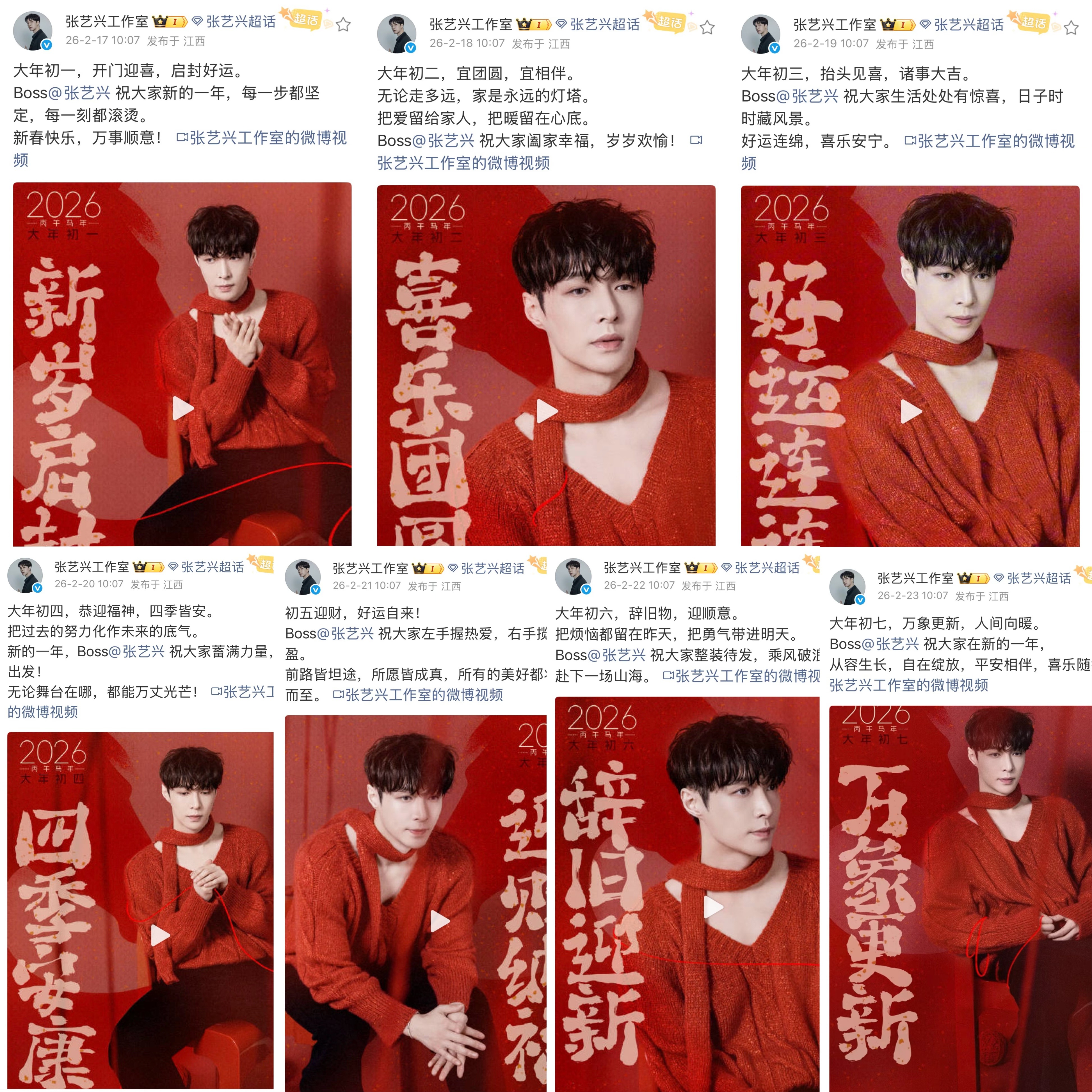 张艺兴真的超级宠粉🥹,出道十三年,跟粉丝还这么如胶似漆,过年期间的物料保持日更不断,天天送新春祝福,很真诚很爱,给整个内娱独一份了。和没工作rfs的人没什么好说的,负面缠身的人不要沾边根正苗红的大明星了