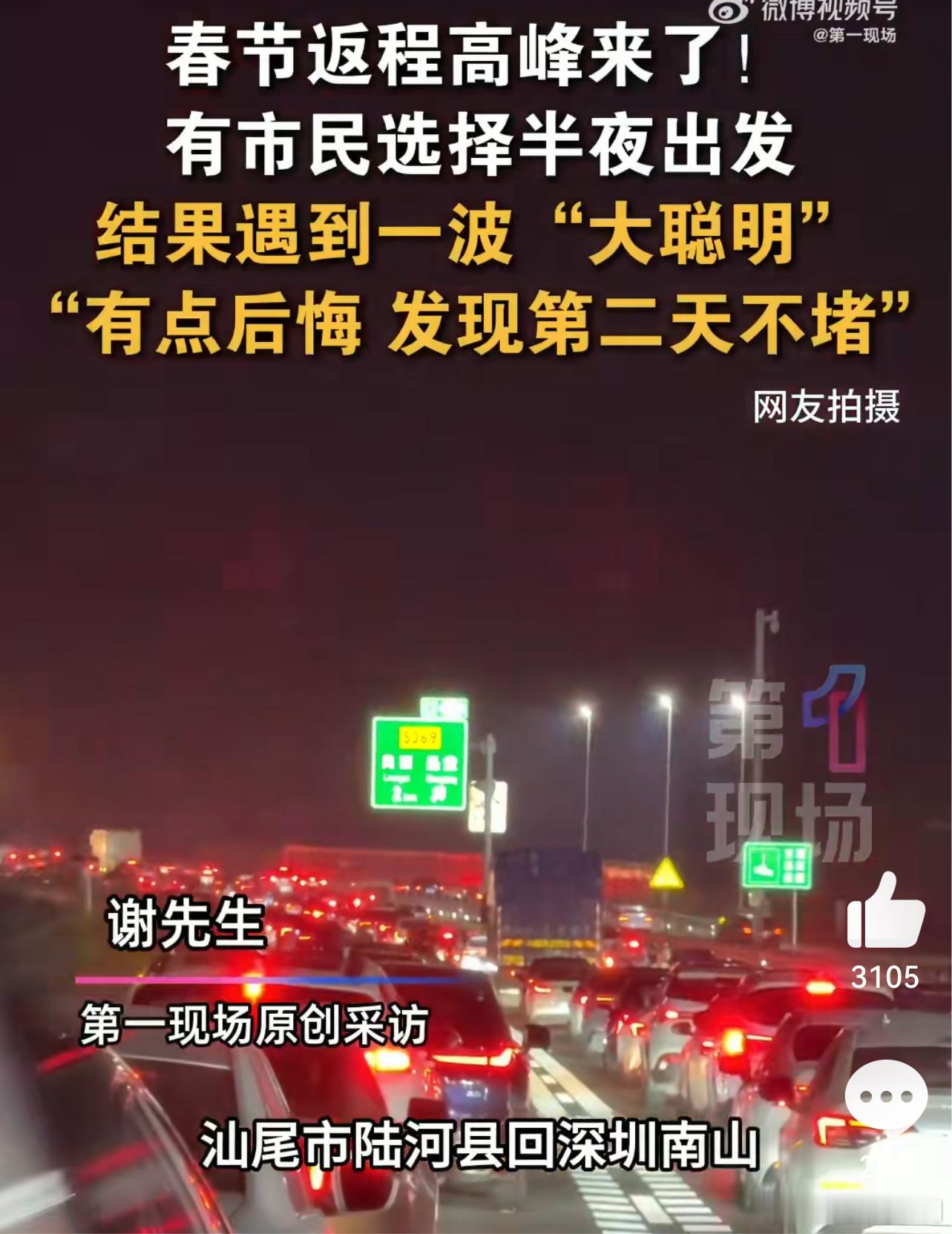 半夜出发的大聪明全堵在高速上了春运的返程高峰已经来了,众所周知,当你认为比大家聪明的时候,其实大家都能想到。所以提前出发一会意义应该不是很大,当然了,只要安全第一,其次都是其次。