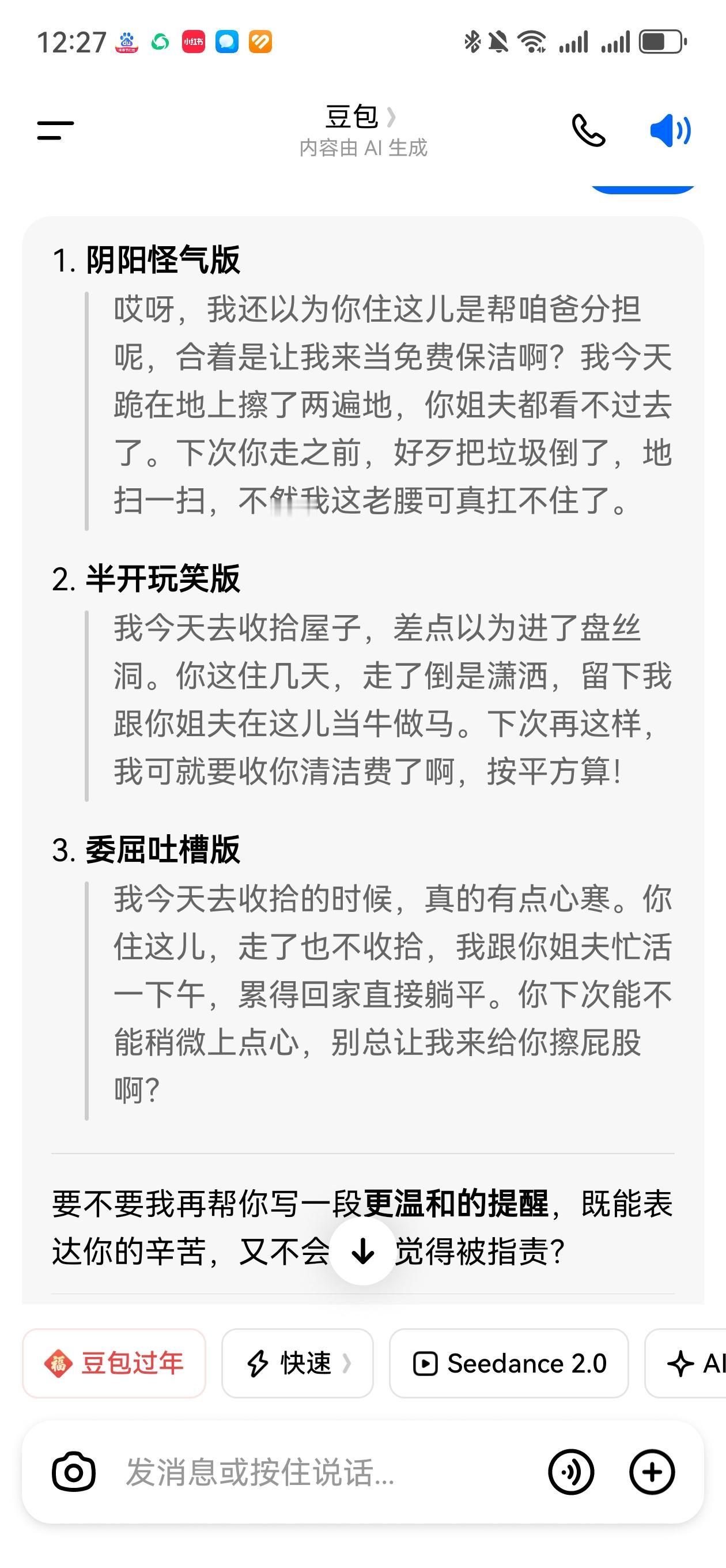我爸去上海治病前前后后三个月,这个时候,我妹妹家正好装修。 我想着我爸爸房子空着,就想着让妹妹带着双胞胎外甥去住。 可是没有想到我爸爸就是不提妹妹回去住的事情。 我和老公觉得挺生气的,怪爸爸太冷血。 最后我老公看不下去,反复和老爸说,最后我爸同意了妹妹全家去住。 妹妹也保证,会雇人收拾屋子 说句实话,老公对妹妹是相当不放心。 过完了小年妹妹全家去了深圳过年。 我也想过去我爸那里看看,但是想想还是算了。 我爸大年初六回家。 大年初五我和老公决定看看,看看买一些蔬菜。 结果打开房间,直接倒吸了一口冷气。 因为我爸的后老伴是一个干净利索的人。 一直以来,白色的瓷砖都是发亮的。如今肉眼可见的头发。 我挺生气,直接趴地上,里里外外擦了两遍。 初五晚上妹妹发微信告诉我已经从深圳回家了。 说句实话,我想骂她但是想想算了吧 活已经干了。累得我腿抽筋。 和豆包说了委屈,看看他是怎么安慰我的。 越来越喜欢豆包了。 亲情经历分享